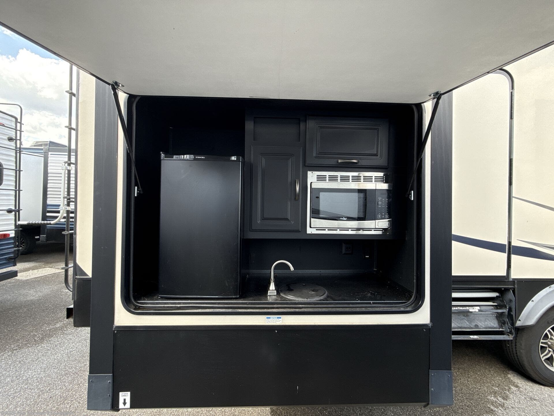 Get ready to camp in comfort when you choose to camp in this Sandpiper fifth wheel by Forest River. This model features sleeping space for up to six people with a rear queen bed and two tri-fold hide-a-bed sofas in the front living area. Along the front of this unit there is an entertainment center where you can watch a movie on rainy afternoons with the 50" LED pop-up TV as you snuggle up next to the fireplace. With two entry doors, you can easily enter this unit and be in the kitchen area, or you can enter through the rear door and have easy access to the bathroom. The exterior kitchen is ideal for storing drinks or snacks and there is a bumper mount swivel gas grill for hot dogs!