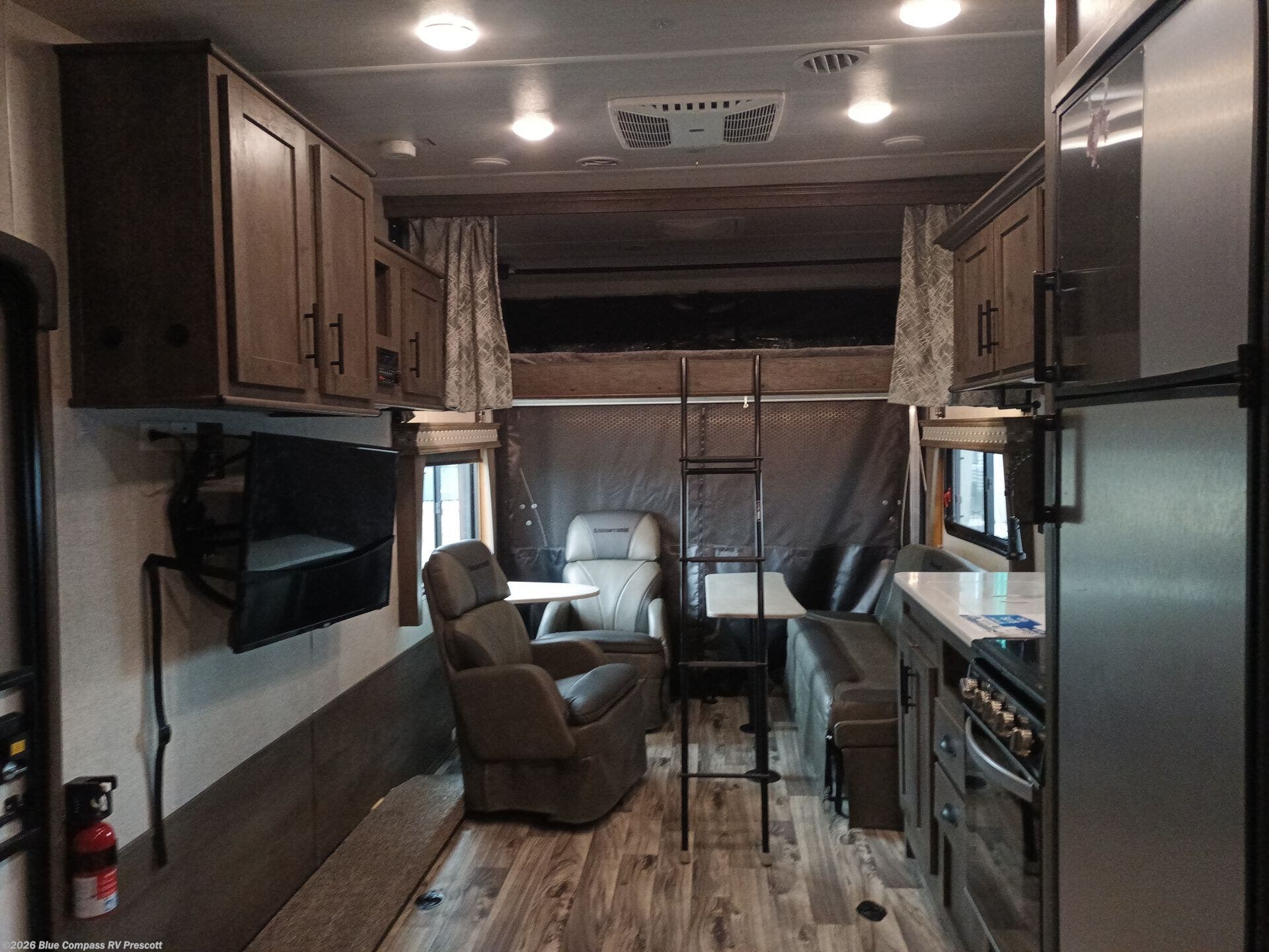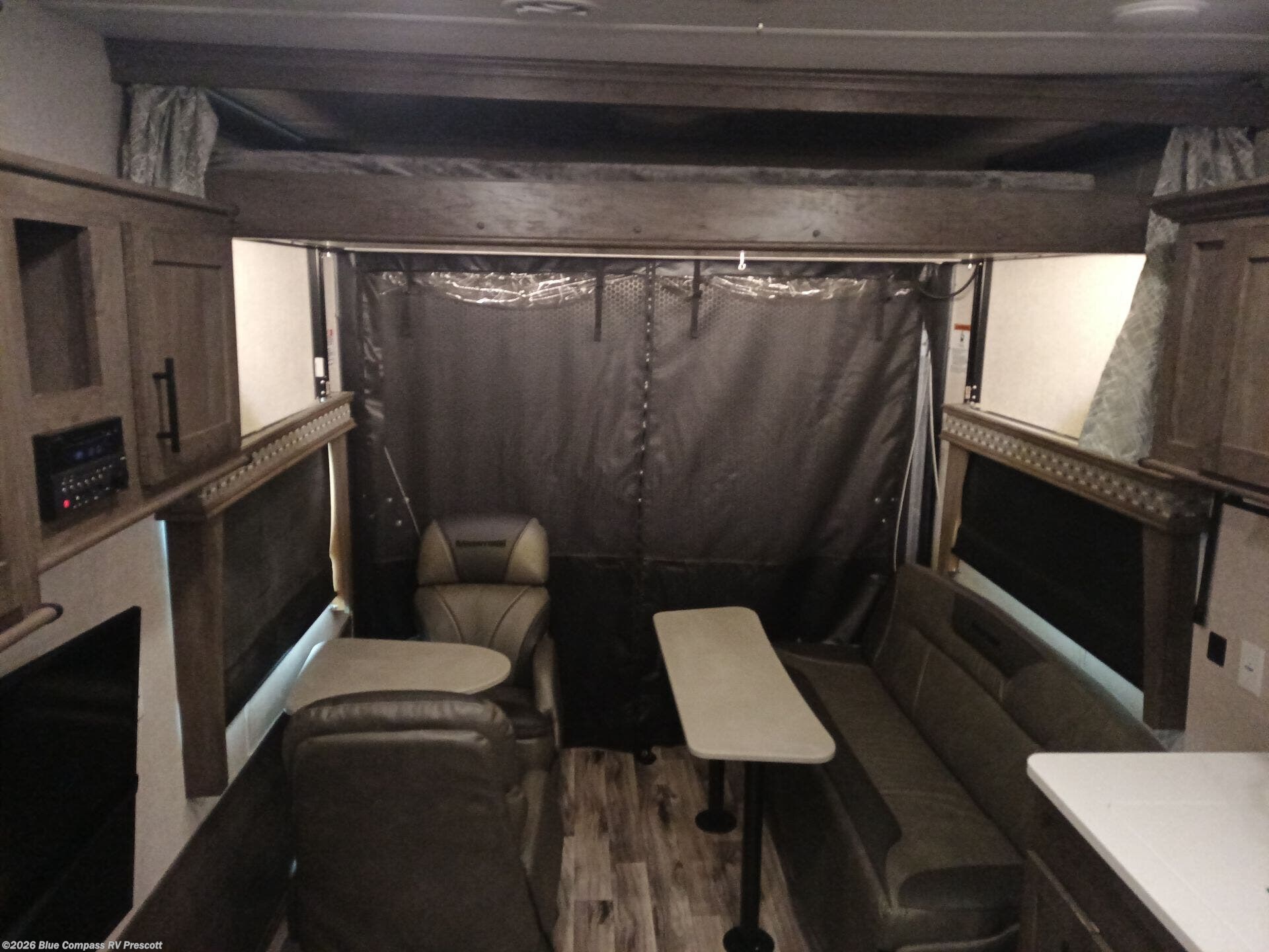 With 13' 4" of cargo space, a flip sofa with a table across from two chairs with a table, and a front full-size bed, you will have enough room to bring your off-road toys and even a friend or two in this Sandstorm toy hauler! Next to the bed is the front corner full bathroom equipped with everything you will need to get squeaky clean each day. Throughout the model there are USB charging ports so that you can stay up to date while you are away and an optional Kenwood sound system with interior and exterior speakers for you to crank up the tunes whether you're inside or outside!