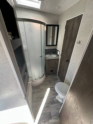 The bathroom is designed for easy use on the go, supported by the black tank flush, water heater bypass, and practical layout.