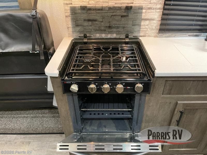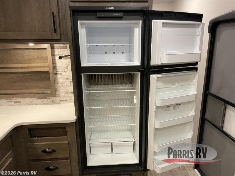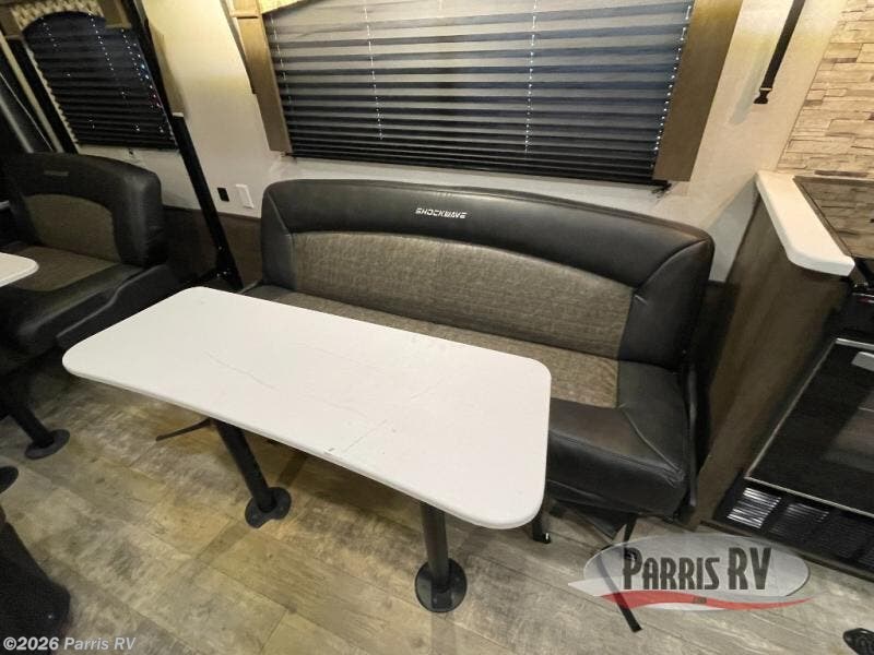 You'll appreciate a more spacious interior thanks to the slide out in the main living area, and the 15' 11" cargo space will provide plenty of room to transport your favorite ride-on toys. The sofa slide is standard in glass but you can choose the optional slide in metal. There is also an electric pass-through dinette and two chairs with a table for multiple seating arrangements. This model includes a dual entry bath that will create a front master bedroom you are sure to love, and your guests can sleep on the electric bed or the sofas in the garage area.