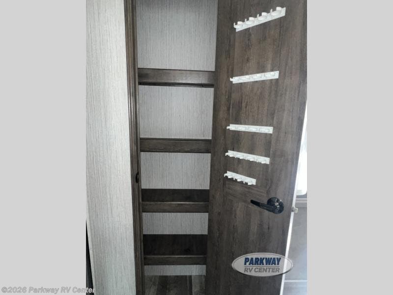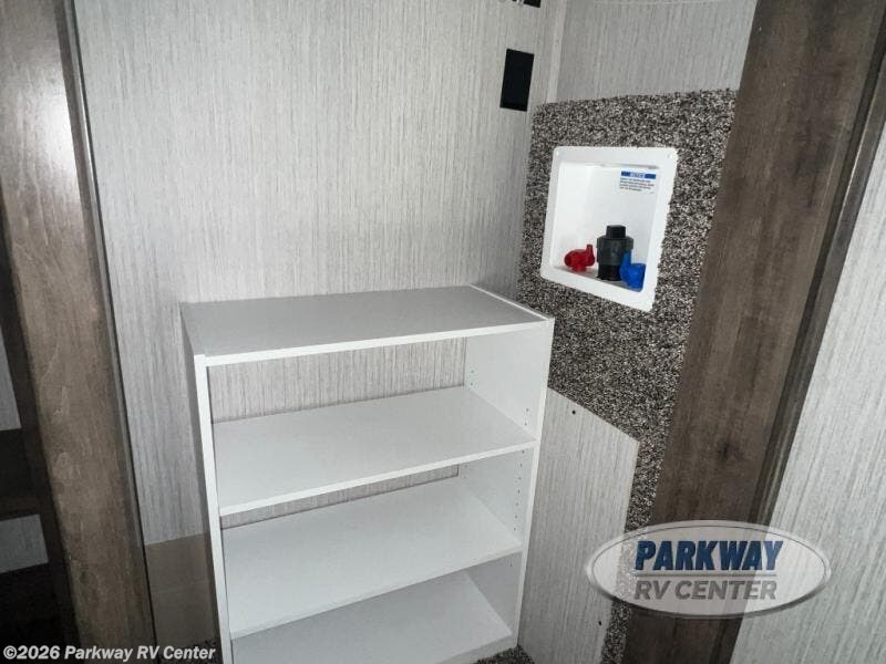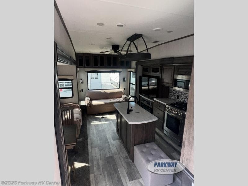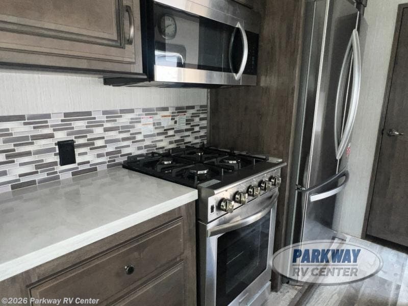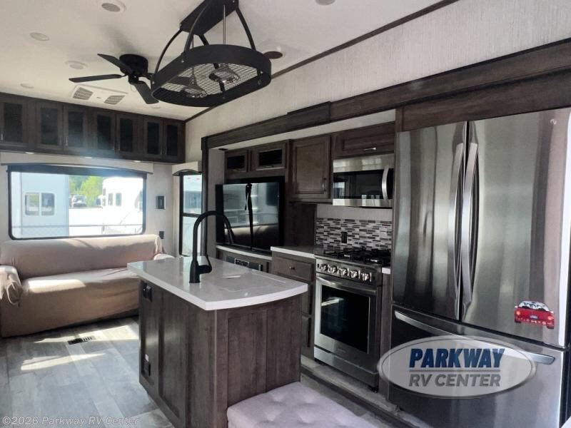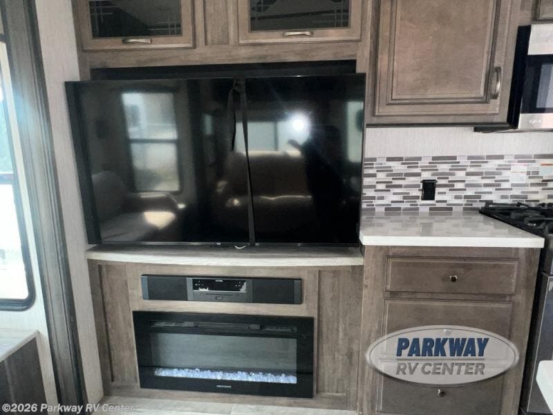 Any couple would love having this fifth wheel at the campsite with triple slides offering a spacious interior, extra sleeping space on the furniture for any overnight guests, and all the storage inside and outside for those longer trips. The cook will enjoy preparing and serving meals on the oversized kitchen island with solid surface counter space and a sink to keep everything clean. The residential refrigerator and the floor to ceiling pantry can hold all of the cold ingredients, paper goods, and snacks necessary to keep everyone fed. The free standing table with four chairs offers a great place to dine and work, and the theater seats along with the rear tri-fold hide-a-bed sofa offer a place to visit and enjoy the 50" LED HDTV with cozy fireplace below. And the drop down pass-through storage, the 16' electric awning and the bumper mount swivel gas grill give you more living, storage and cooking space.