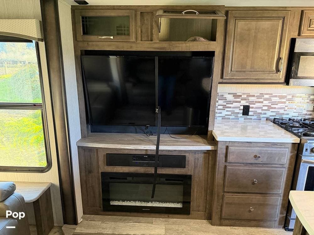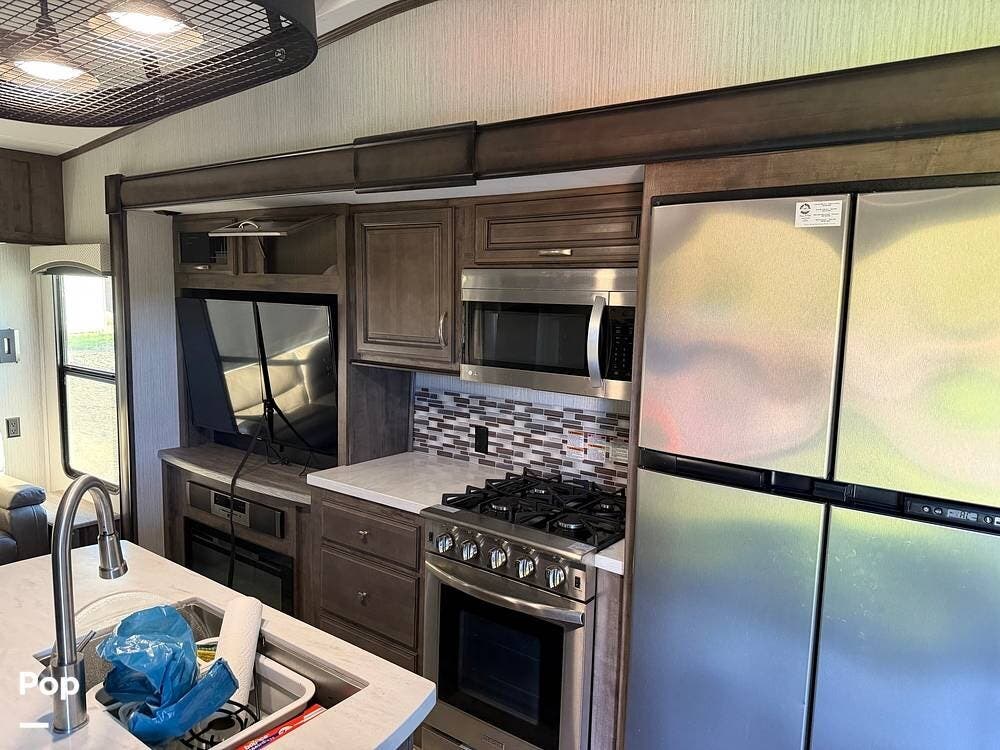 Inside, you get a front bedroom with a king bed slide and washer/dryer prep. The kitchen has a big island, tall pantry, three-burner stove, convection microwave, and a residential-size refrigerator.