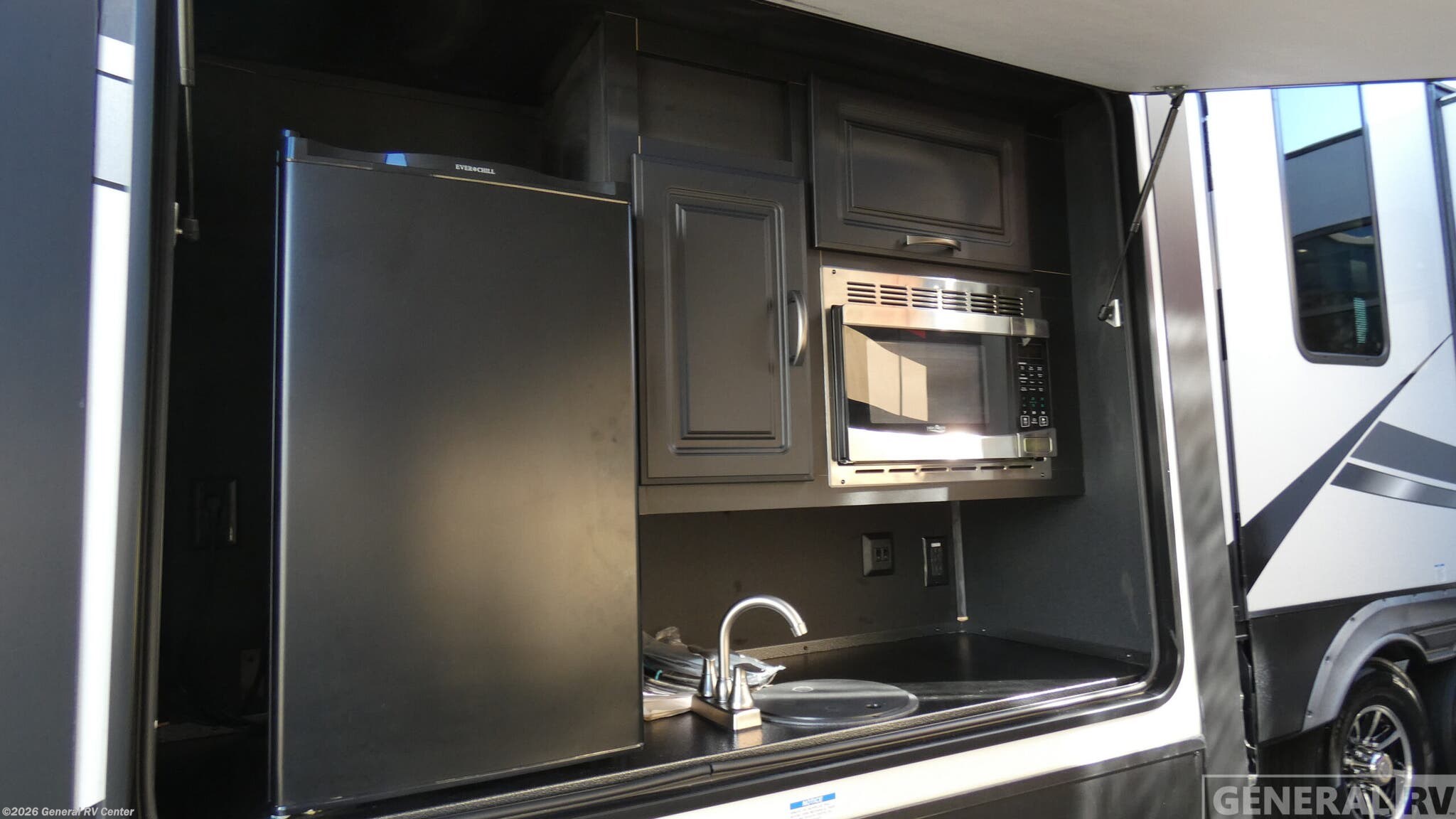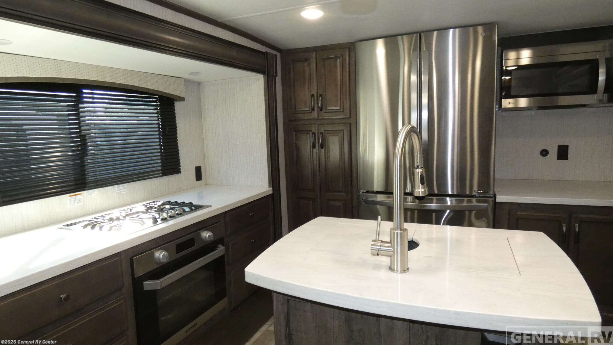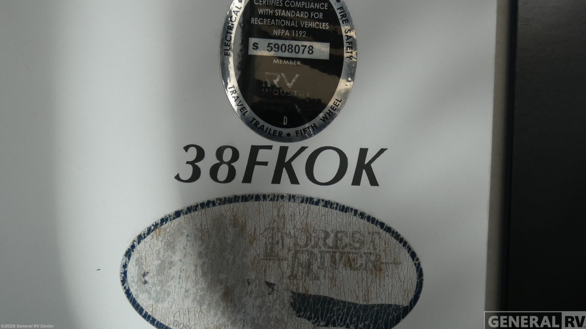 **Forest River Sierra fifth wheel 38FKOK highlights:** * Front Separate Kitchen * Buffet Cabinet * Breakfast Dinette * Dual Entry * Middle Living Area * Exterior Kitchen Perfect for full-time RVing and those longer trips, this fifth wheel offers plenty of space for you to move about easily from the front separate kitchen to the rear private bedroom. The cook will have a spacious kitchen with an island, a buffet cabinet, lots of countertops, and plenty of storage for ingredients and leftovers in the pantry and residential refrigerator. The exterior kitchen gives the cook even more choices when feeding everyone. Six people can visit comfortably in the separate living area while relaxing on the tri-fold hide-a-bed sofas and theater seats while watching the 50" LED HDTV. And when you are ready to call it a night, you can get cleaned up in the full bathroom which offers a prepped space for a washer/dryer option, and fall quickly to sleep on the king pillowtop mattress. There is so much more to love, start your adventure! With any Sierra luxury fifth wheel by Forest River you will receive the best materials for the long haul giving you a solid foundation, and the interior offers luxurious comfort throughout. Constructed with a welded aluminum-framed, vacuum bonded laminated superstructure, a full enclosed underbelly with Underbelly Armor for any climate traveling, and a full walk-on roof. The Platinum package comes standard and provides solid surface countertops, two air conditioners, and a 6-point hydraulic leveling system. The Ultimate kitchen package gives you a stainless refrigerator with 1,000-watt inverter, a 30" over-the-range stainless microwave, and soft close doors and drawers. You will find many more luxurious, residential and convenient features, choose your favorite Sierra today!