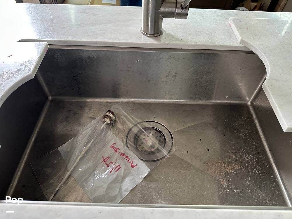 The kitchen features an island with a sink, microwave, stove, oven, and ample storage space. 1/2 bath with medicine cabinet, sink with storage, and head.