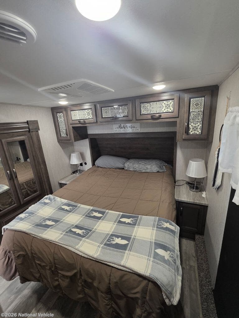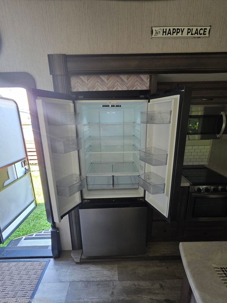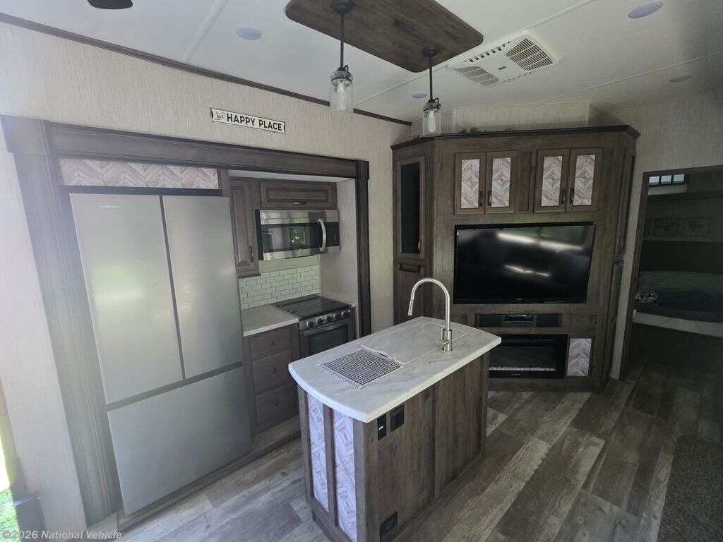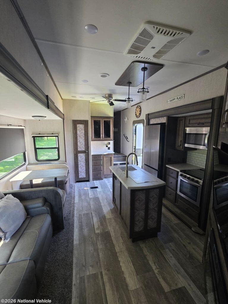 Step inside to an open, inviting main living area highlighted by opposing slides that create a wide, residential feel. The comfortable seating, large entertainment center, and electric fireplace make this space ideal for relaxing after a day outdoors. The gourmet kitchen is thoughtfully designed with solid-surface countertops, a kitchen island, residential-size refrigerator, three-burner cooktop, oven, microwave, and generous pantry space?perfect for cooking for a crowd or enjoying long-term stays.