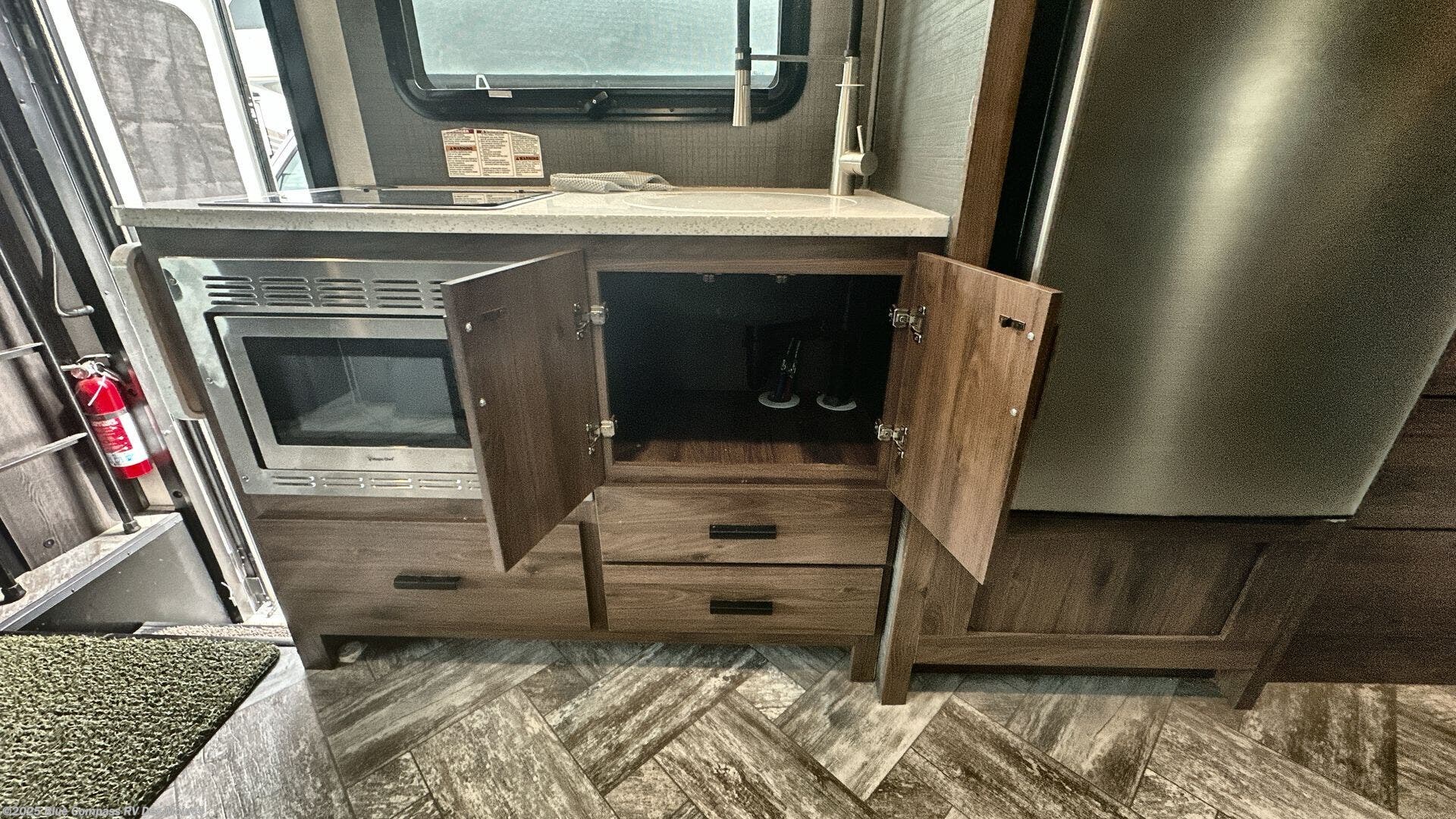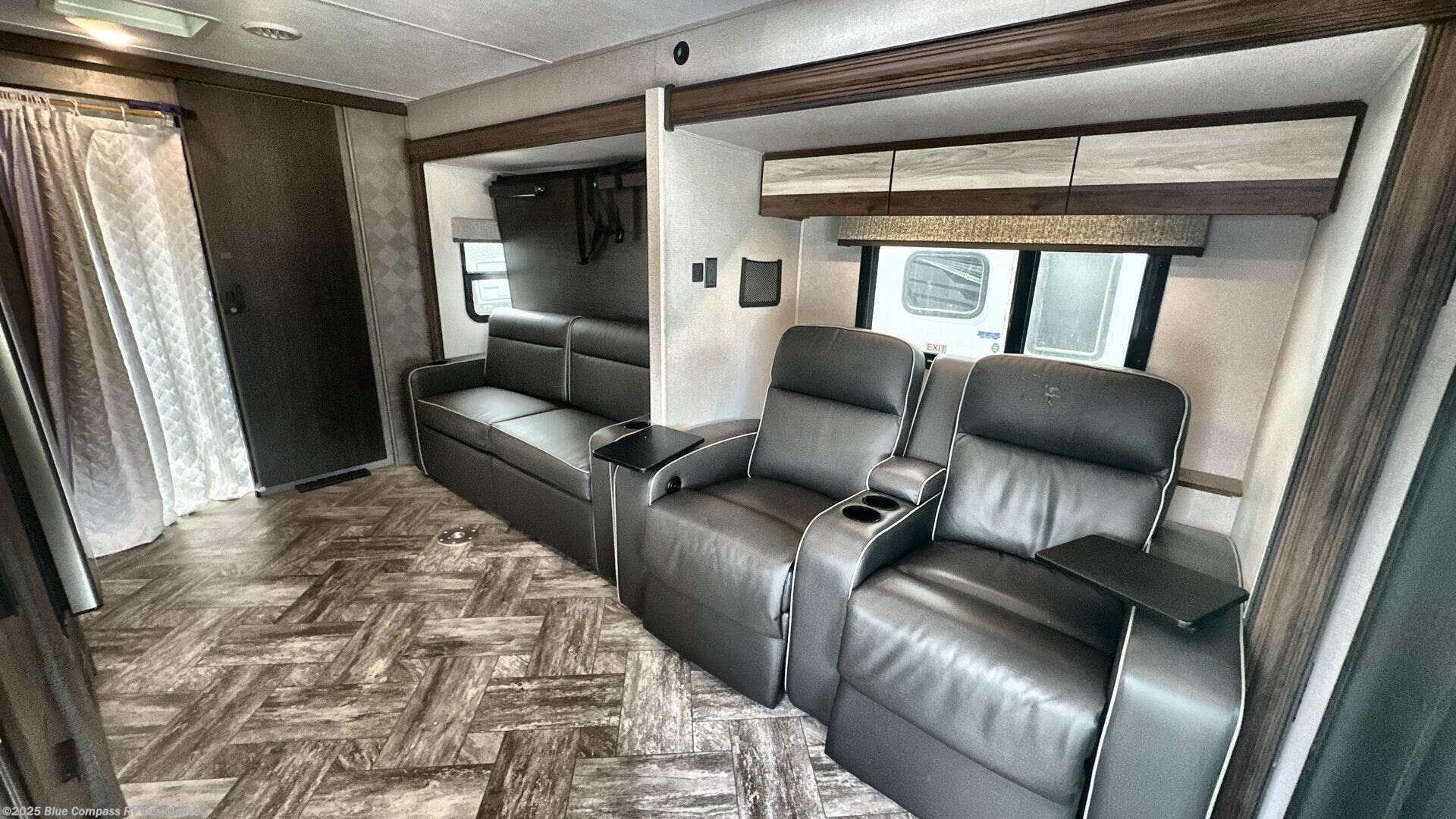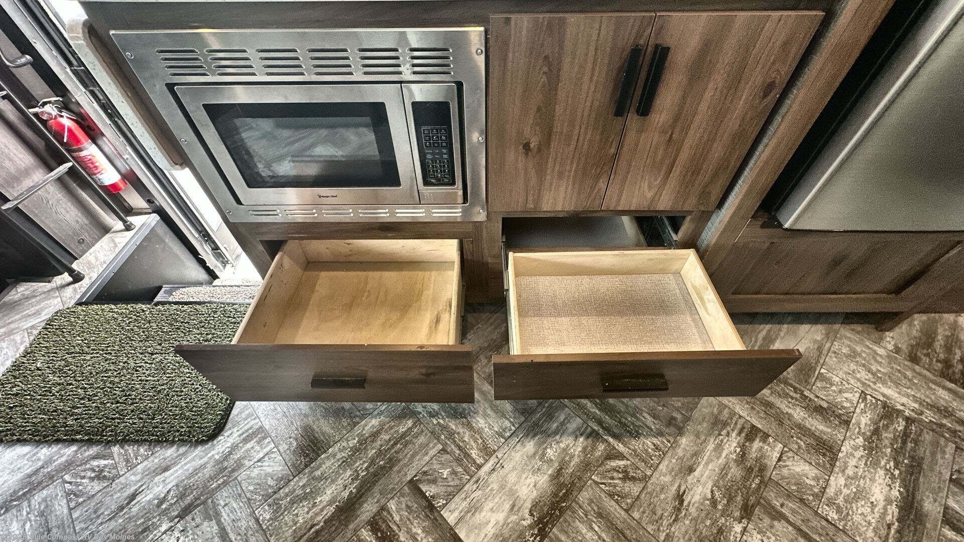 A full rear bathroom, a galley kitchen, and a queen Murphy bed/sofa combo is all you need for a couple's weekend road trip or even a family event with sleeping space for two more on the cabover bunk. The 54" x 80" bunk mat is over the two captain's chairs or you can choose to add the optional Trekker cap with a built in entertainment center. Part of the living area becomes your bedroom once you easily set up the queen Murphy bed after moving the removable table, and grabbing your pajamas from the drawers with hidden storage behind the 12V TV. And you never know when someone might sleep on the power theater seats. You can even watch shows outdoors when you add the optional 12V outside TV and relax under the 15'6" power awning with LED lights!