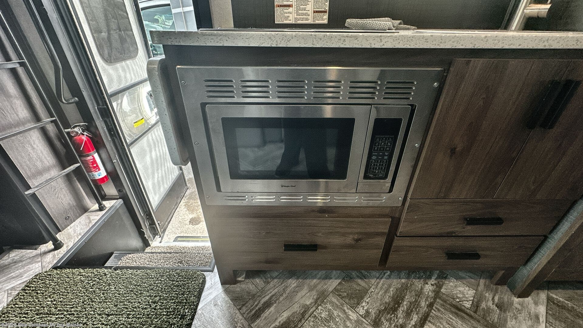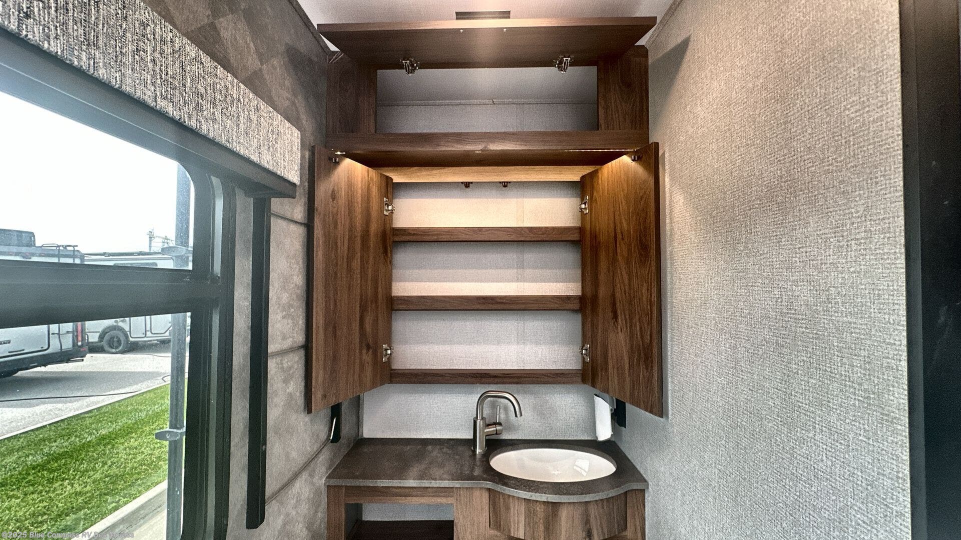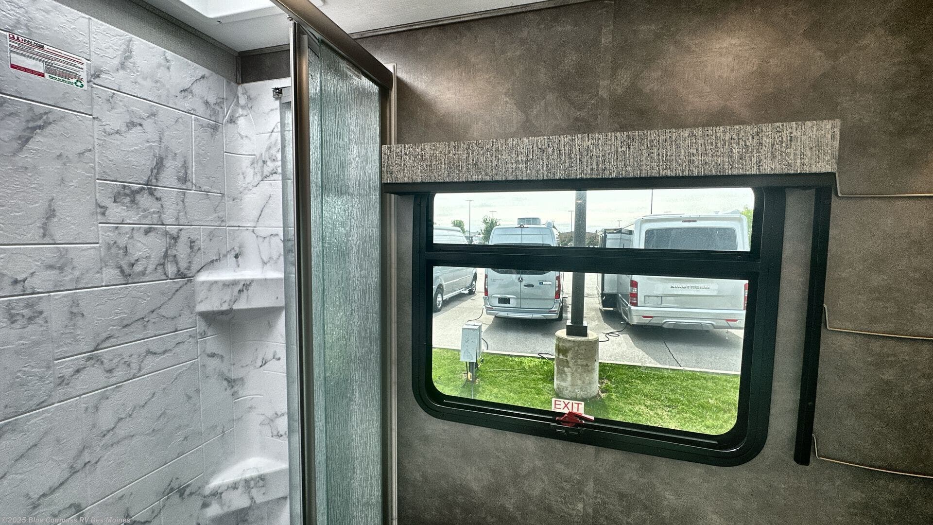 A full rear bathroom, a galley kitchen, and a queen Murphy bed/sofa combo is all you need for a couple's weekend road trip or even a family event with sleeping space for two more on the cabover bunk. The 54" x 80" bunk mat is over the two captain's chairs or you can choose to add the optional Trekker cap with a built in entertainment center. Part of the living area becomes your bedroom once you easily set up the queen Murphy bed after moving the removable table, and grabbing your pajamas from the drawers with hidden storage behind the 12V TV. And you never know when someone might sleep on the power theater seats. You can even watch shows outdoors when you add the optional 12V outside TV and relax under the 15'6" power awning with LED lights!