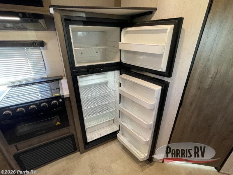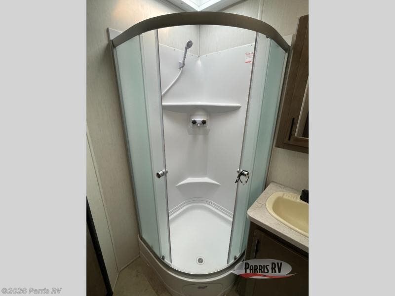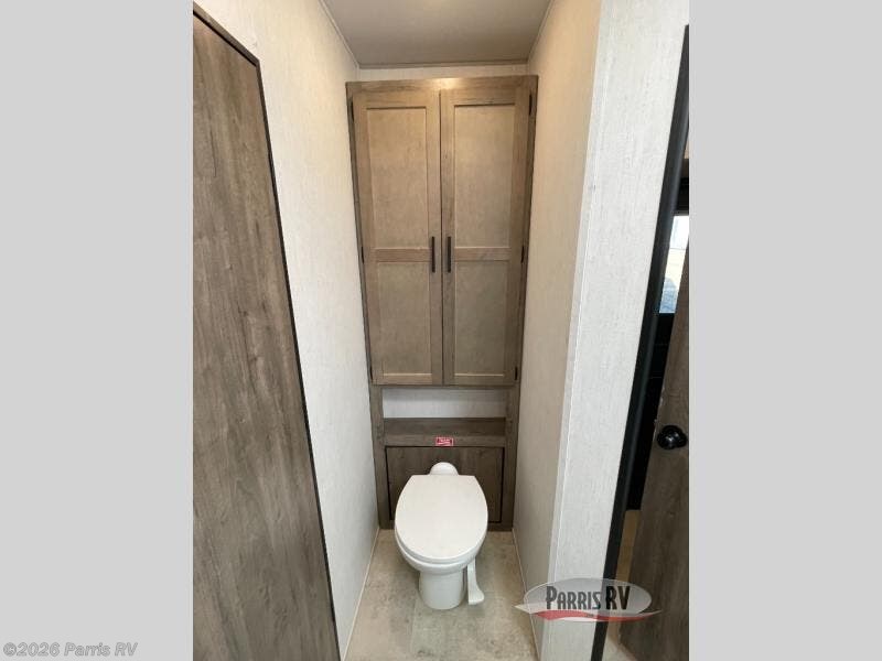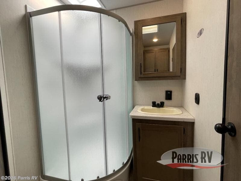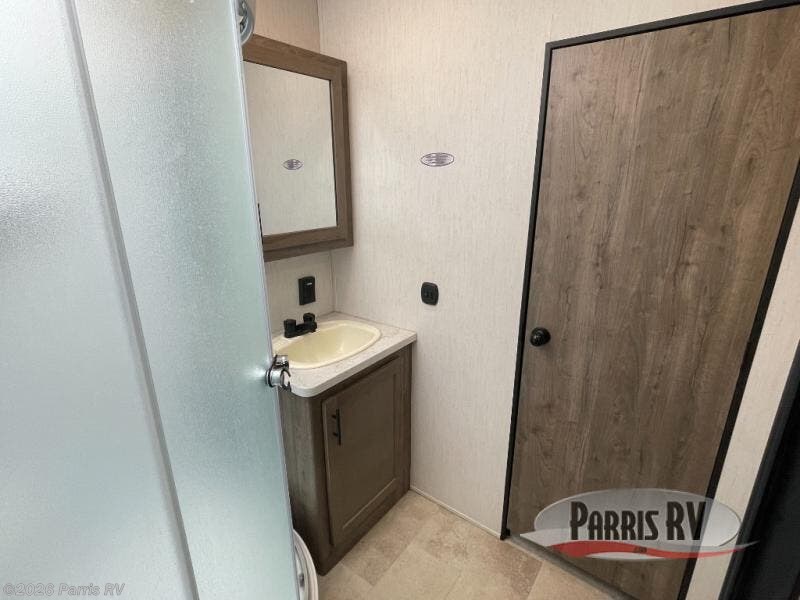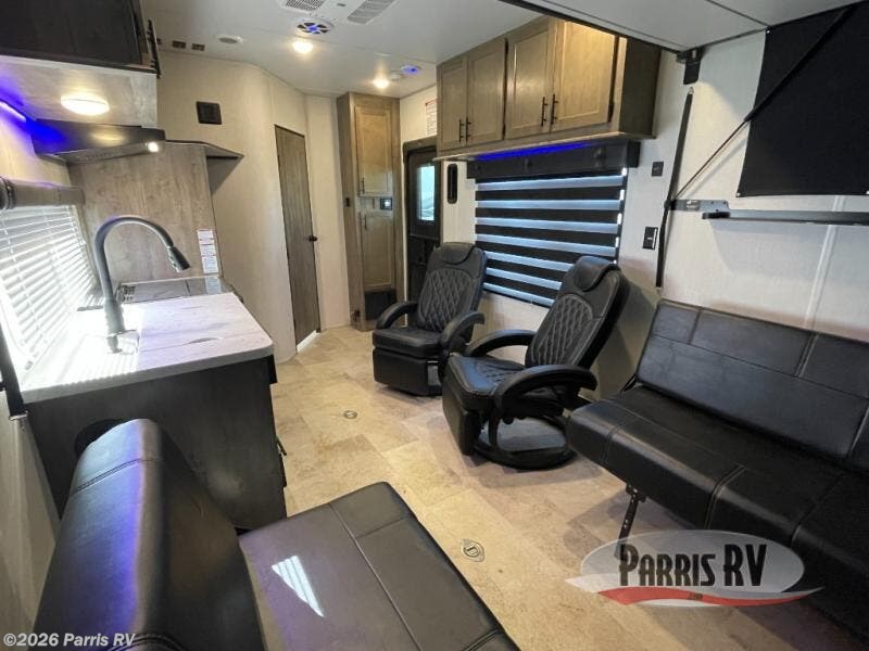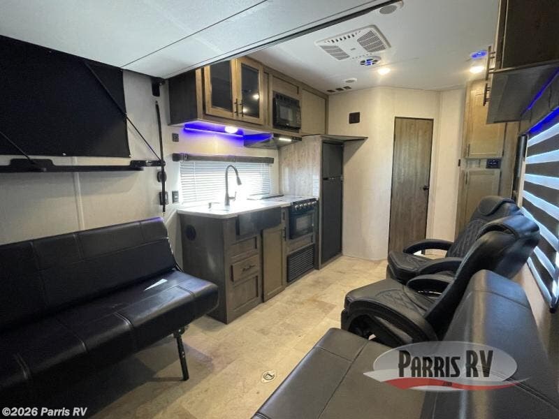 This dual entry toy hauler will keep you happy on every outdoor adventure. Once your dirt bikes are unloaded, relax on the two roll-overs sofas and enjoy lunch before heading out for the day. You can also choose to add two optional lounge chairs for more seating space if needed. The walk-through bath includes a medicine cabinet for your necessities and a linen closet for clean towels, and the front master bedroom includes a Rogue king bed for your comfort.