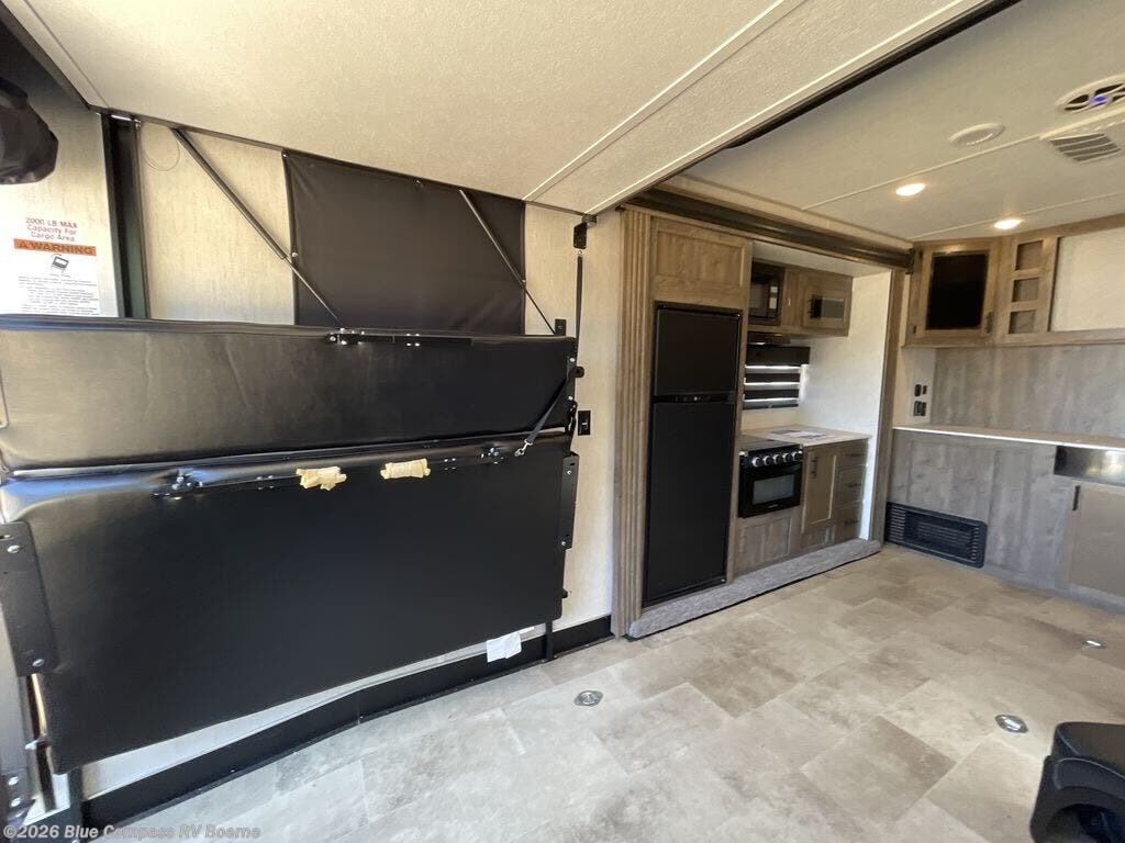 Camping with your favorite ride-on toys is easier than ever in this toy hauler. The 15' total garage space provides tons of space for your gear, plus there is a slide out that will give the chef more room to cook meals. Relax on the roll-overs sofas or add the optional lounge chairs for a more at-home feel. There is plenty of counter space in the kitchen, plus a pantry for snacks or dry goods. You will appreciate the dual entry bath that will give you a private entrance into the front bedroom. Here, you can sleep soundly on the king bed and store your clothes in the dual wardrobes.