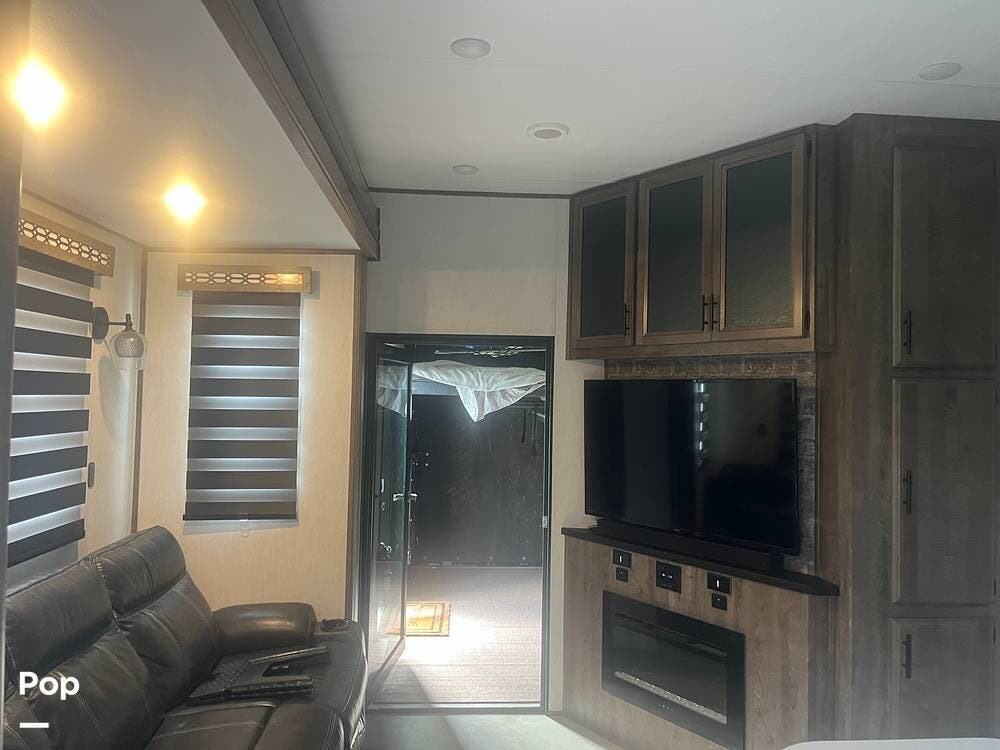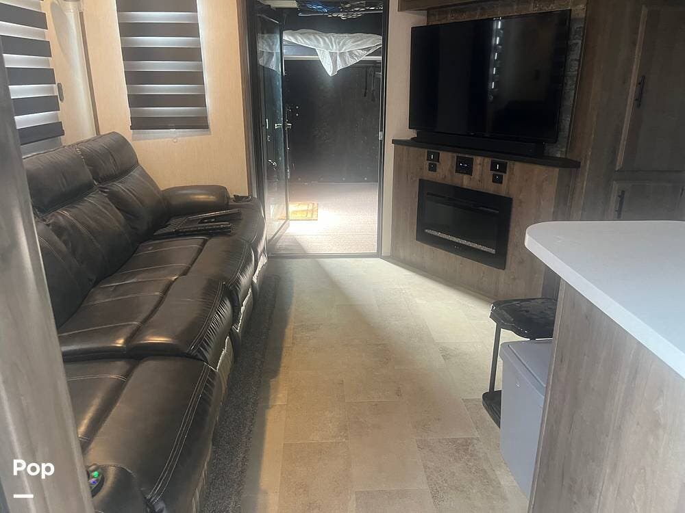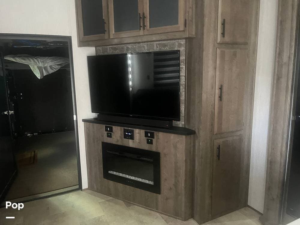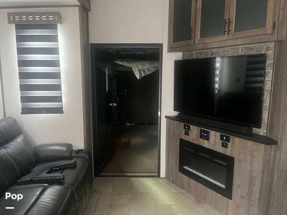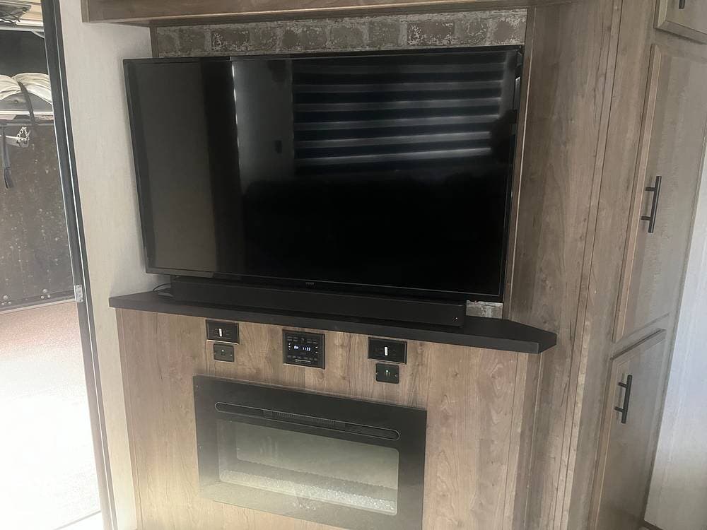 This fifth wheel has a comfortable open living space with a sofa recliner with heat and vibration settings to enjoy after playing with your toys. An electric fireplace and entertainment center include a TV with surround sound for a relaxing evening environment.