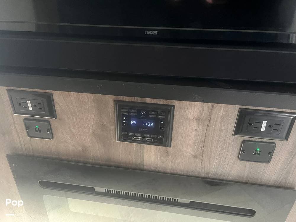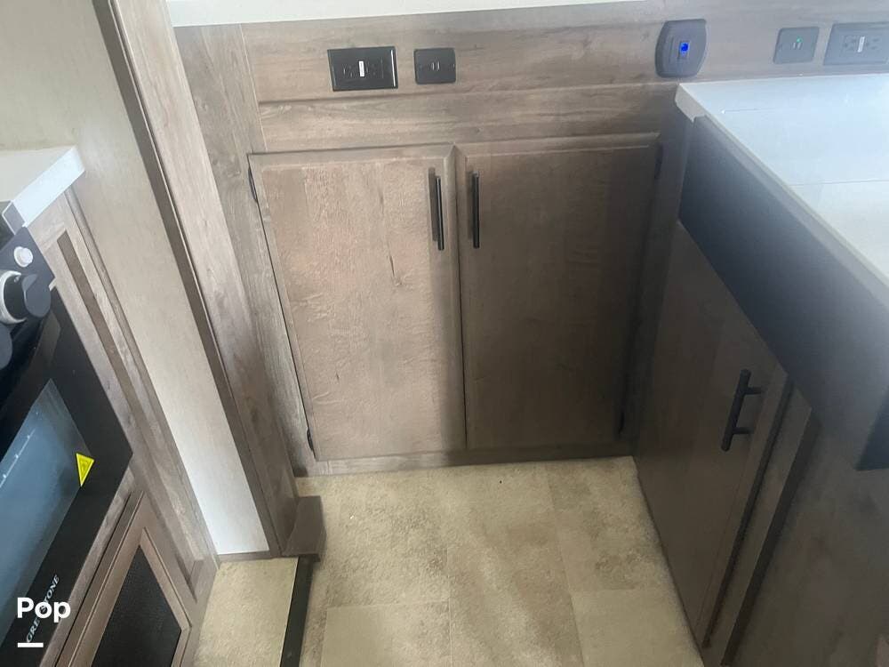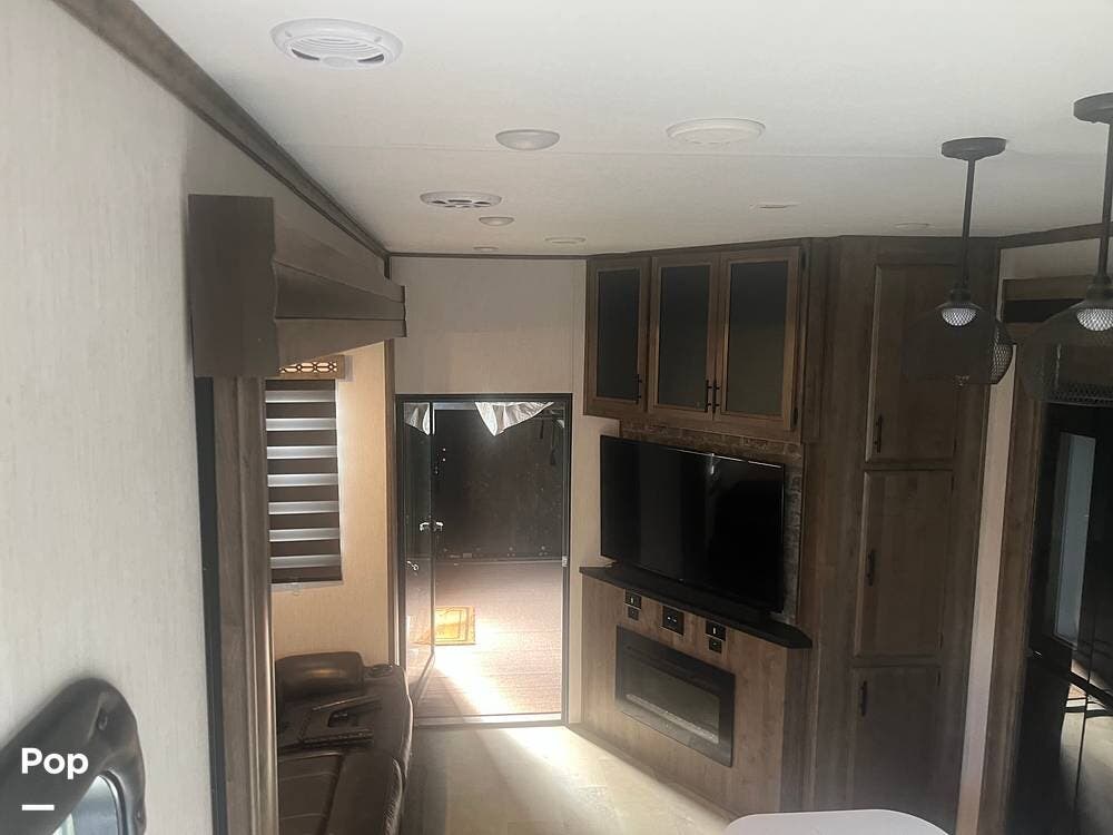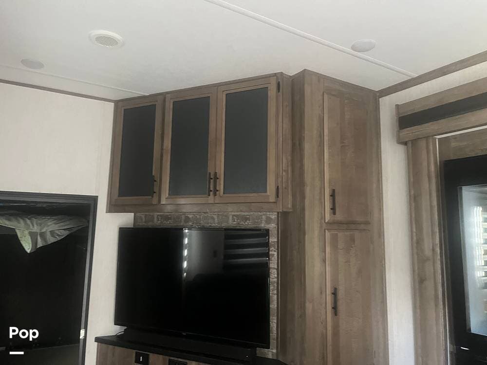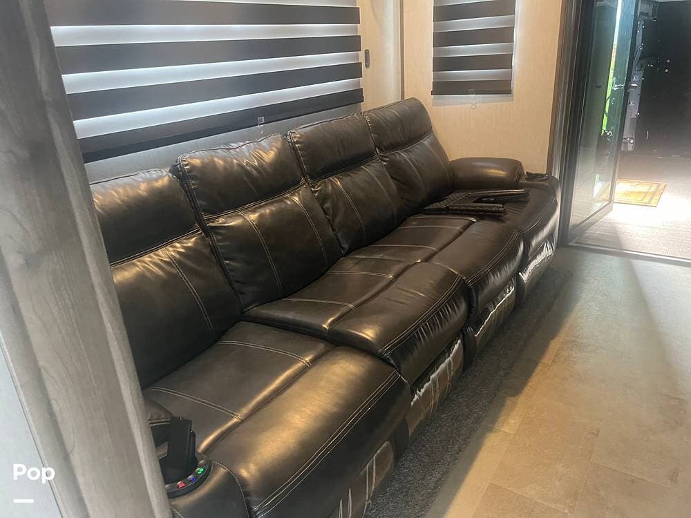 This fifth wheel has a comfortable open living space with a sofa recliner with heat and vibration settings to enjoy after playing with your toys. An electric fireplace and entertainment center include a TV with surround sound for a relaxing evening environment.