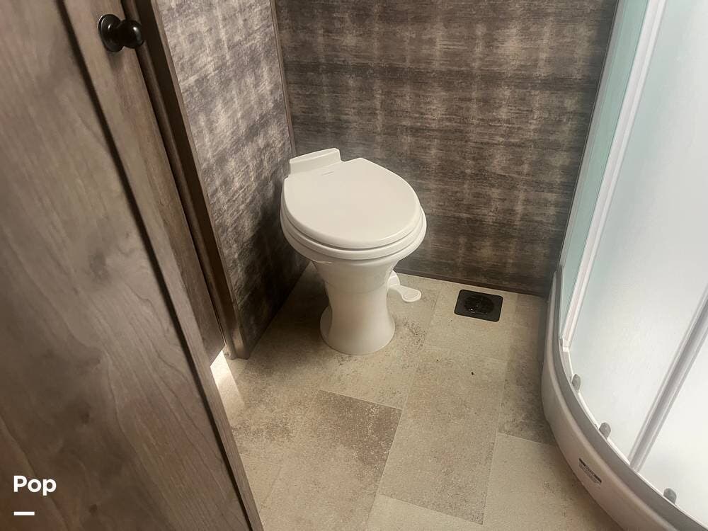 This Vengeance has 1 1/2 bathrooms, each with a toilet, sink, and shower. The master bath has a shower with a glass enclosure. The second bathroom is in the garage, with access through the second door.