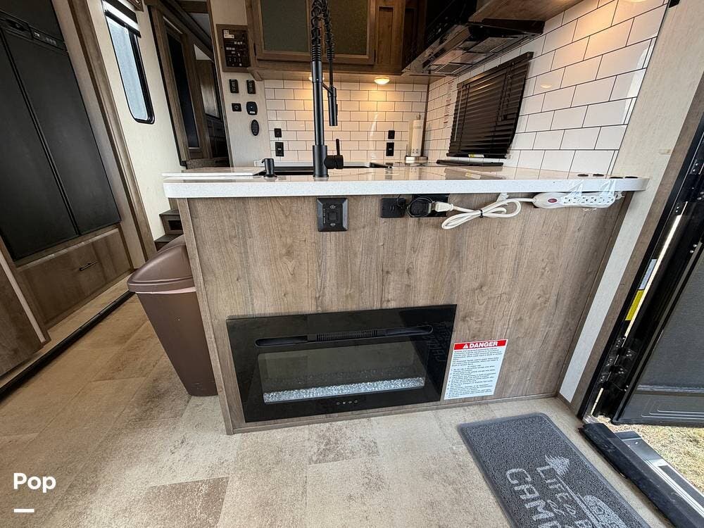 The main living area features theater seating, a large TV, and an electric fireplace, perfect for cozy evenings after a day on the trails.