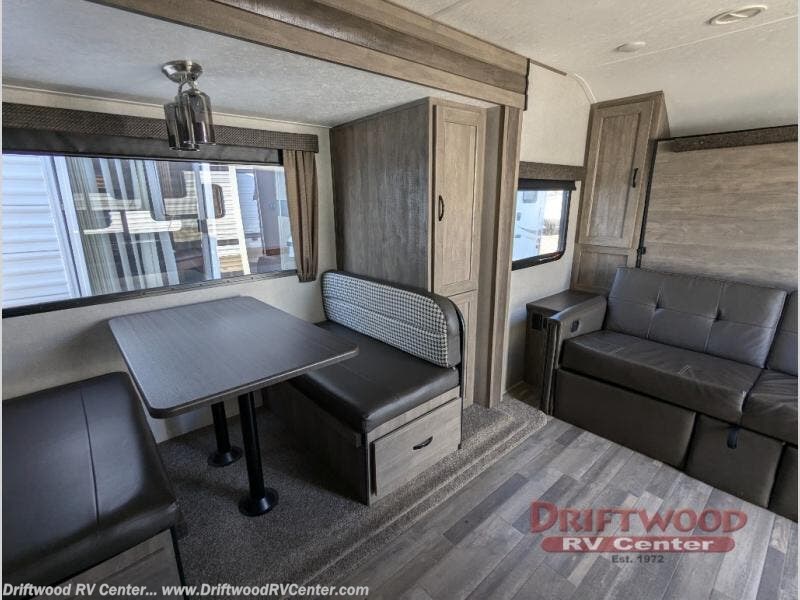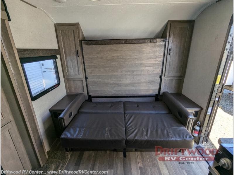 Versatility and comfort go hand-in-hand with this travel trailer thanks to the space saving Murphy bed. Enjoy the jackknife sofa during the day, and the comfortable bed at night. There are dual wardrobes on either side of the bed, plus dual nightstands that are USB and CPAP machine ready. Whip up your best meals on the three burner cooktop, or use the stainless steel 17" oven. This model also includes an upgraded 10.7 cu. ft. residential refrigerator and solid surface kitchen countertops for a more sleek look. You are sure to appreciate the full bath that includes a radius shower and a tall linen closet for bathroom necessities and clean towels!