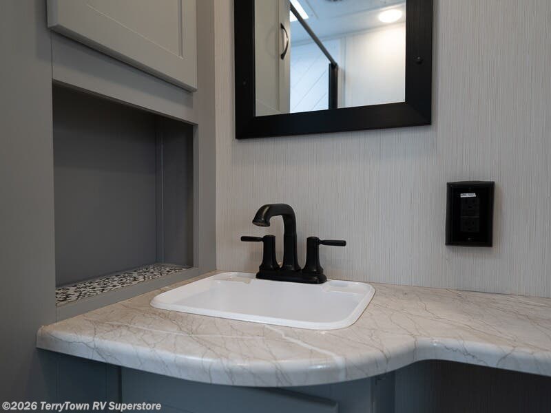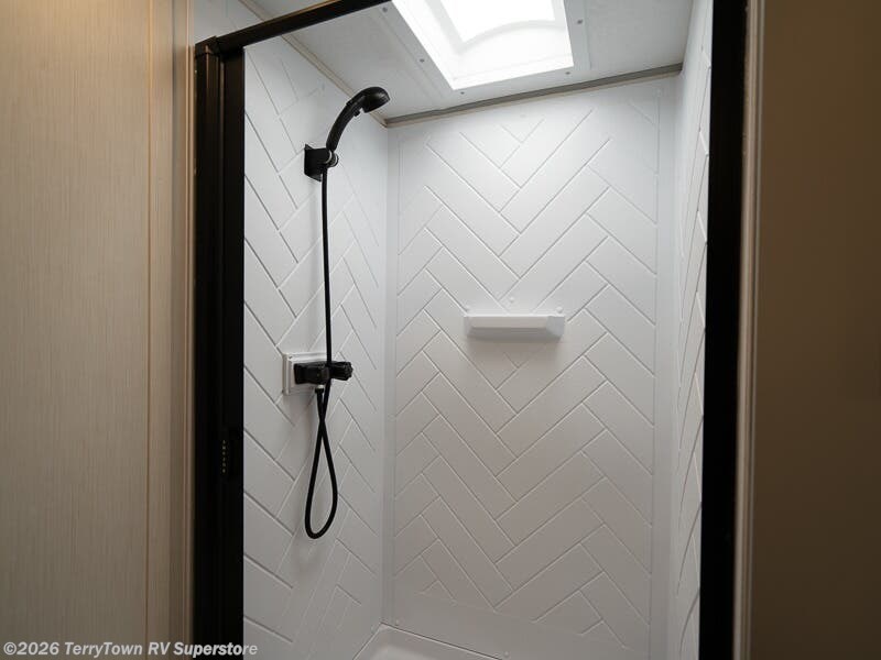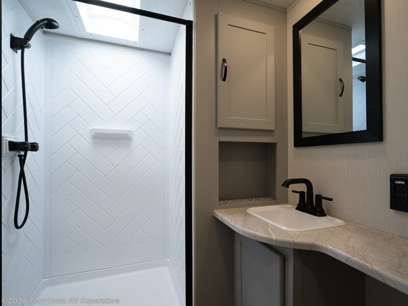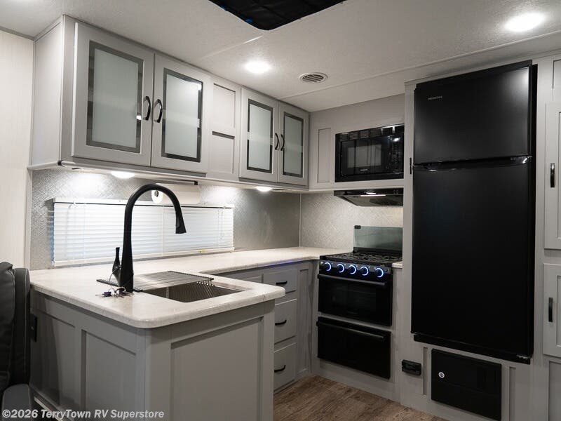 Escape to the Great Outdoors in this Vibe travel trailer. Once you arrive at your campsite, set up the 18' electric awning with LED lights, then grab the fishing poles from the large pass-through storage. You may want to make a quick lunch on the universal outside kitchen before heading out. If the weather isn't cooperating, you can cook on the three burner cooktop or in stainless steel 17' oven, and there is even a residential refrigerator to hold all your ingredients. The spacious full bath includes a 36" x 30" walk-in shower to clean up every day, and there is a linen closet to store clean towels and necessities.