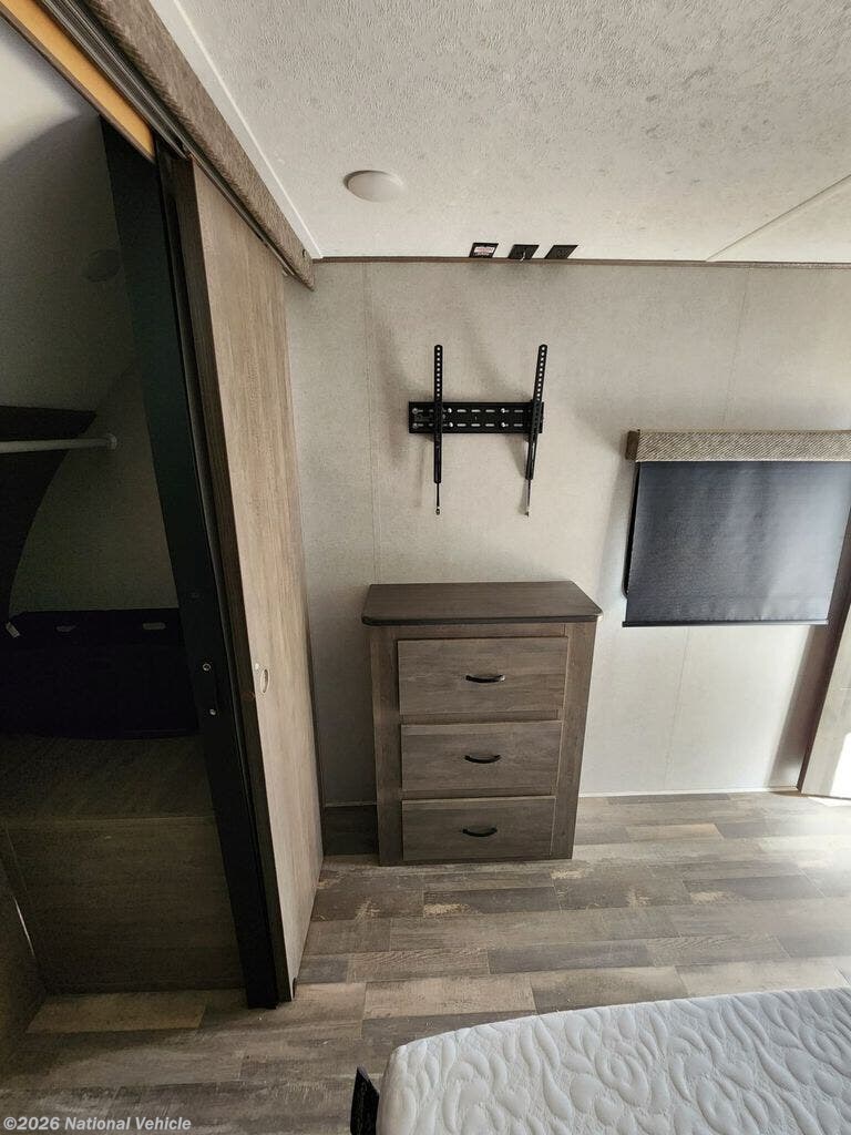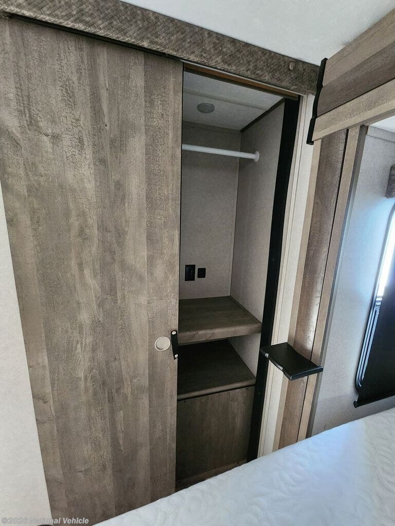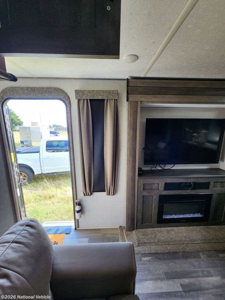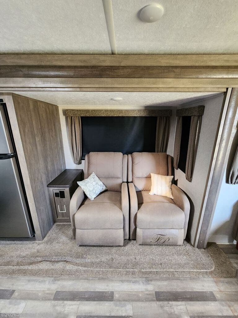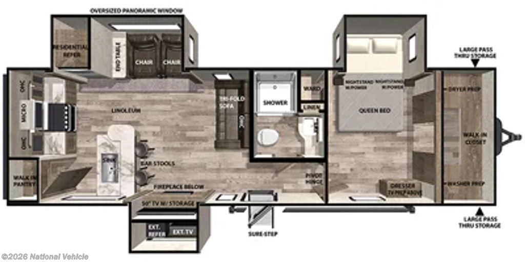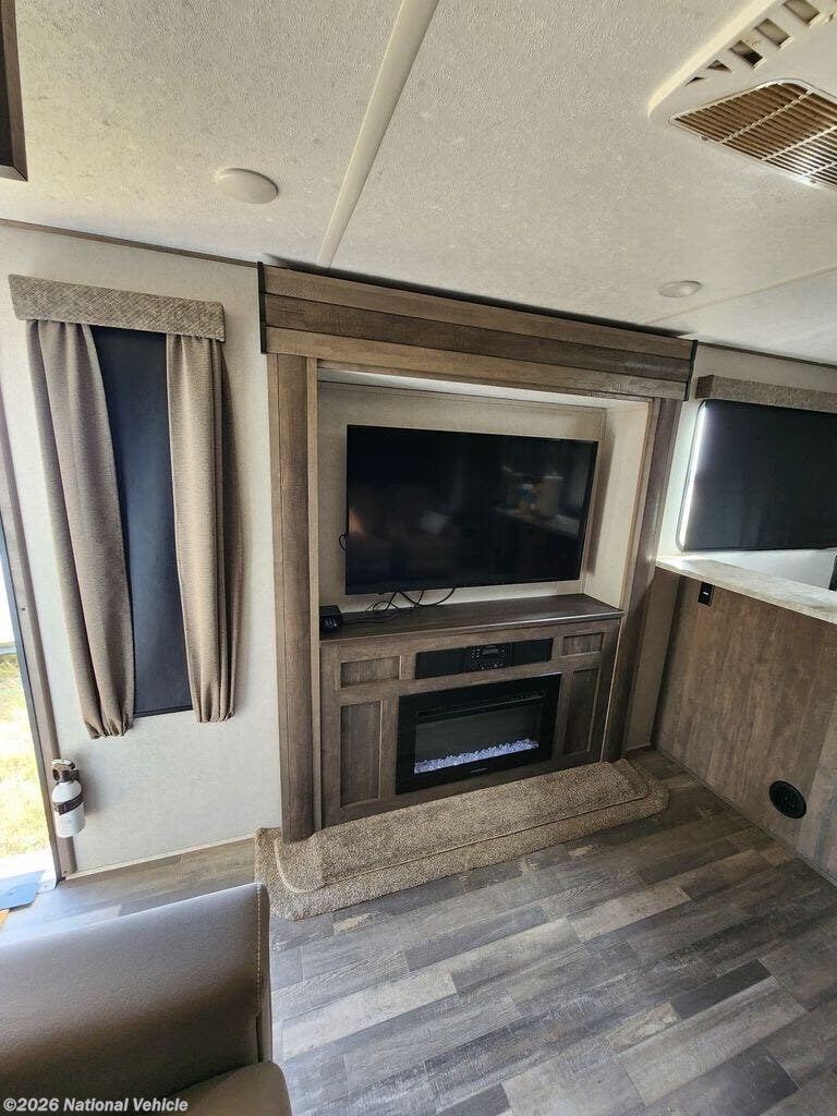 There is no going back to your tent-camping days after touring this travel trailer. The rear kitchen is any chef's dream with its walk-in pantry, residential refrigerator, plus a bar with stools where the kids can enjoy coloring. You will find comfortable seating space on the dual chairs and tri-fold sofa, and the fireplace and 50" TV with storage will feel just like home. The full bath will allow everyone space to clean up each day, and the front private bedroom will be your own oasis away from it all. Here, you will enjoy a slide out queen bed, a dresser where you can add a TV if you choose, plus a front walk-in closet so you can bring along all your favorite outfits!