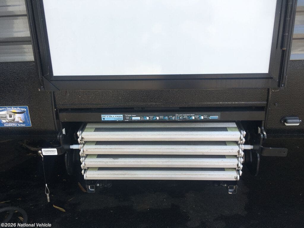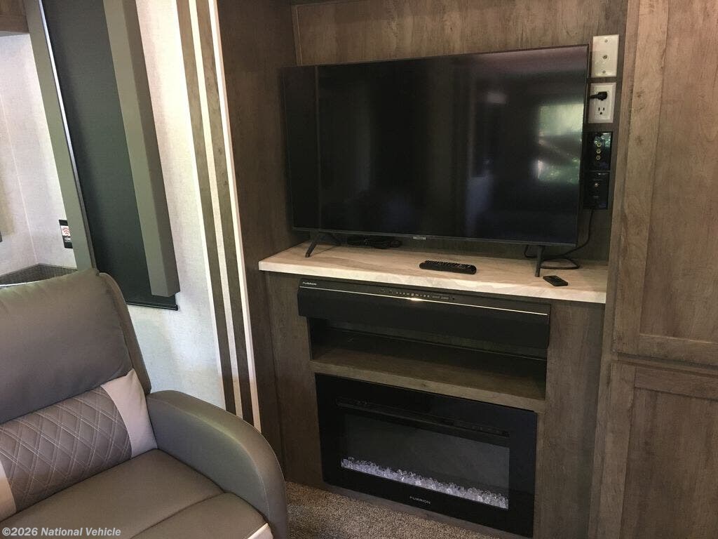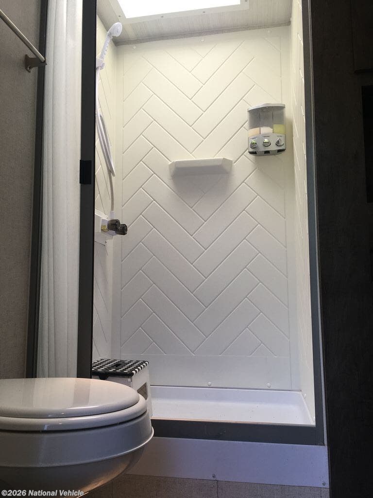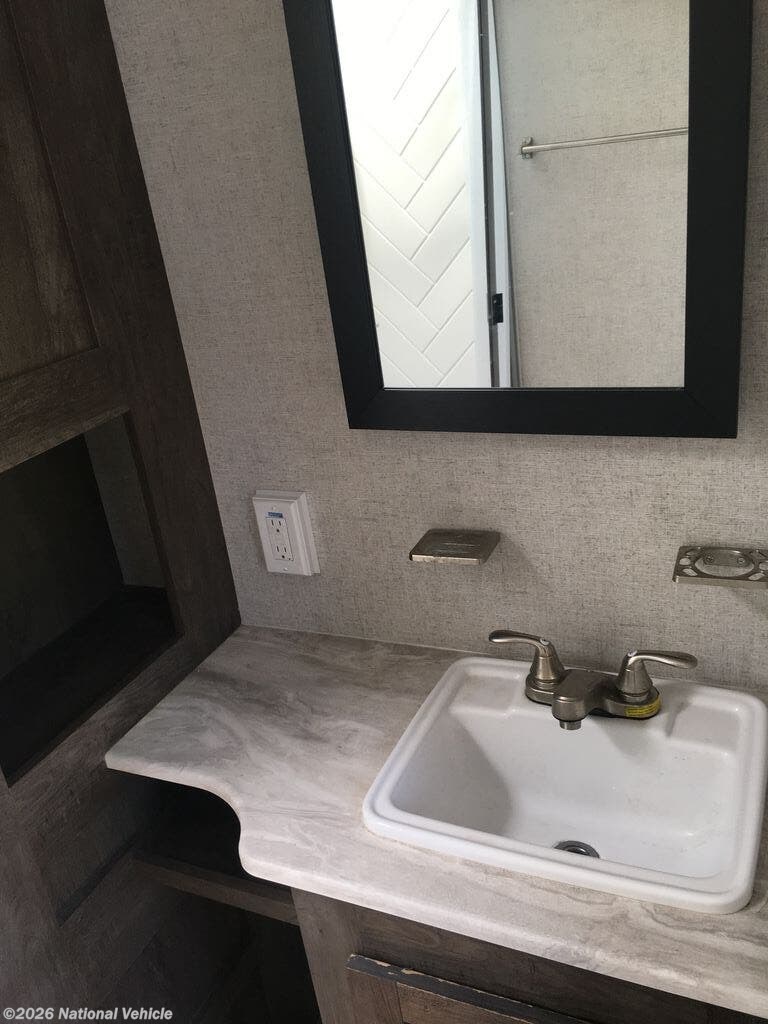 A full bathroom with shower, vanity, and linen storage adds convenience, while multiple slide-outs expand the interior, creating an open and inviting atmosphere. Outside, enjoy a power awning, pass-through storage, and durable construction designed for easy towing and reliable performance.