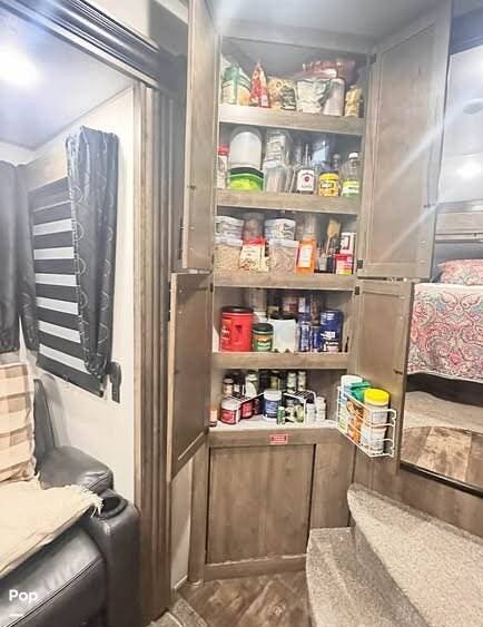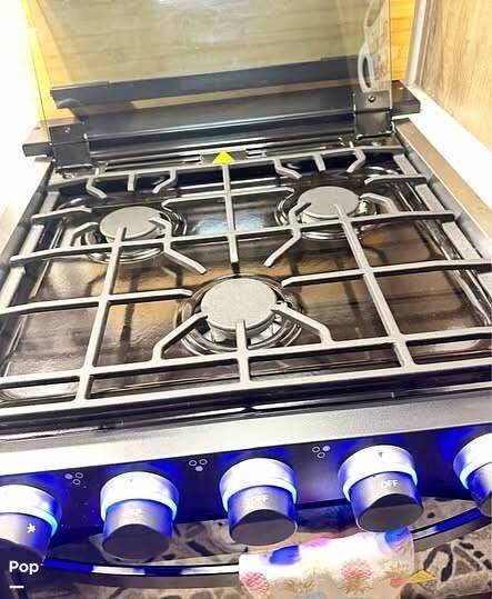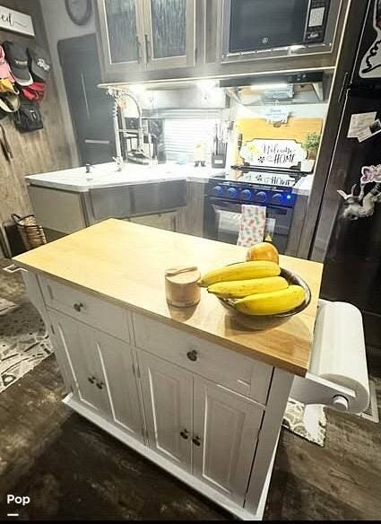 The kitchen is designed for convenience and meal preparation on the go. It features a solid-surface countertop, deep stainless-steel sink with high-rise faucet, and a full-size residential refrigerator to accommodate extended trips. A three-burner stove with oven and microwave provide multiple cooking options, and ample cabinet space ensures you have room for cookware, groceries, and essentials. The layout allows easy movement while still offering the amenities of a home kitchen, perfect for travelers who like to cook and entertain.