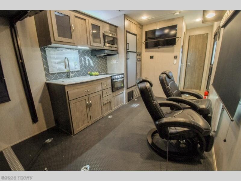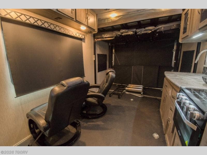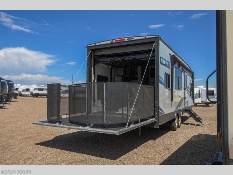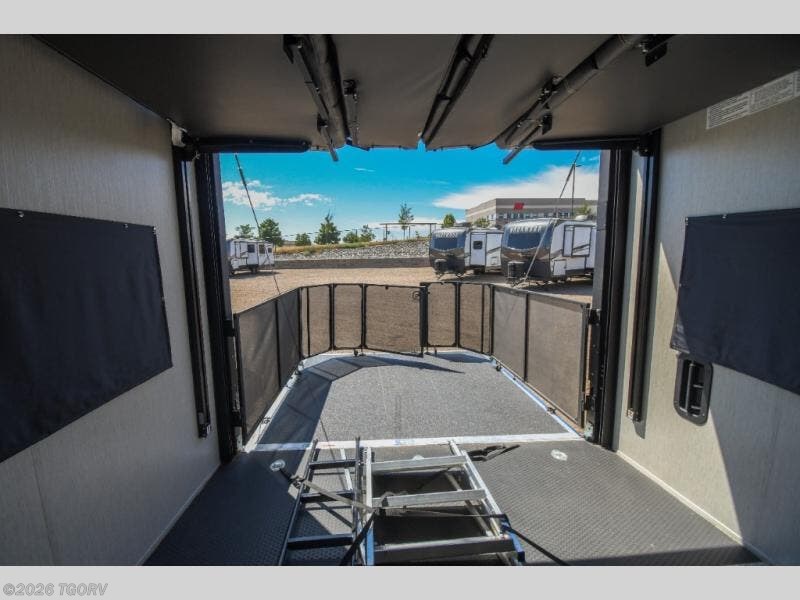 This high profile toy hauler is the one you've been looking for! You can easily sleep six people since it includes two roll-over sofas and a queen bed electric lift, along with the king bed in the master. The dual entry bath is convenient for everyone, and you'll find storage space throughout for all your belongings. The kitchen includes everything you need to prepare a meal after trail riding, including a three burner cooktop, a microwave oven, plus an 8 cu. ft. refrigerator for cold drinks and perishables. You can choose additional optional equipment with this model, like the optional 5.5K Onan generator, the optional ramp door party patio kit, or the optional second 15K BTU A/C!
