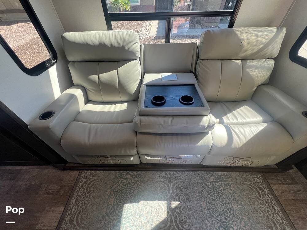 Stadium-style recliners in the living space, an enclosed bathroom, and a large bedroom with sliding door access to the garage.