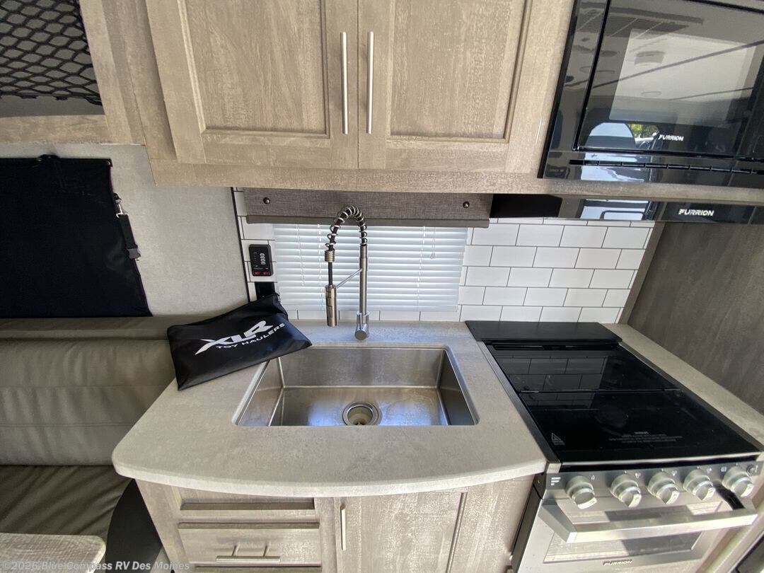 Get out there and explore in style with this XLR Micro Boost toy hauler! With the flip-up sofas and free-standing table, you'll have a comfortable place to enjoy a hearty meal that has been prepared on the three-burner cooktop, and the residential sink will make it easy to clean up after dinner. You will also be able to rest easily each night with the queen-size bed that has been included in the front private bedroom.