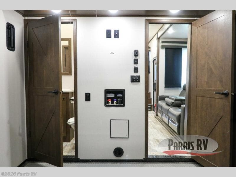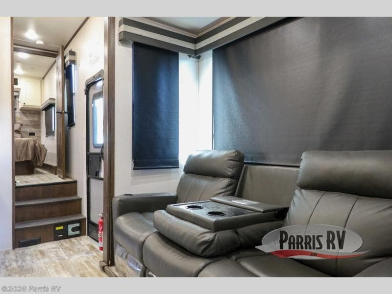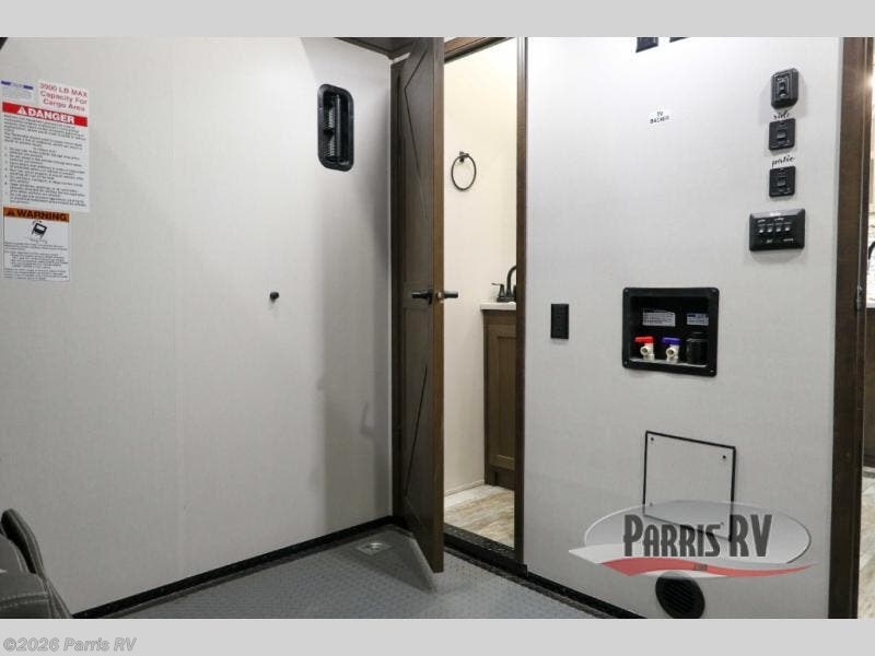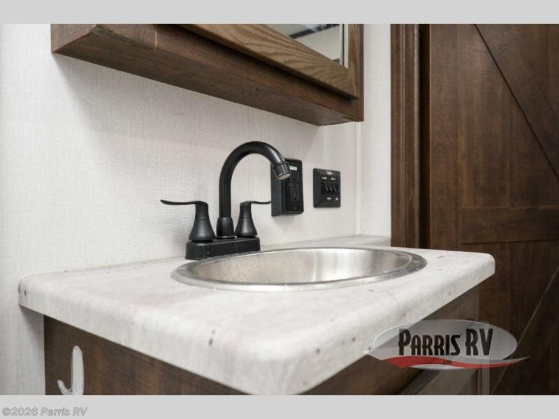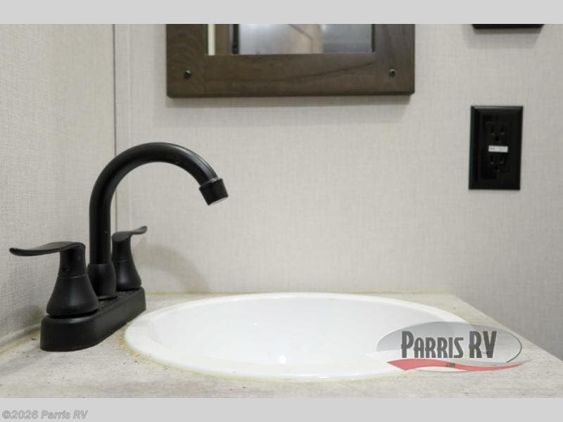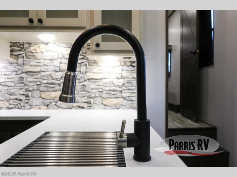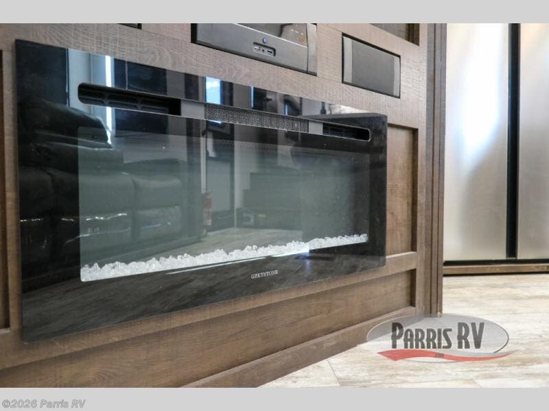 Everyone will enjoy the main living and kitchen area with a 50" TV and electric fireplace after a long day on the trails! You can relax on the sofa slide out while others take turns getting cleaned up in the full bathroom next to the front private bedroom with a king-size bed, and wardrobe slide out, or some might just need to wash their face and hands in the half bath off of the garage. The cook will love the kitchen with a peninsula countertop including a grate style sink with a cover/drying rack, plus the slide out with appliances. The garage offers 11' of cargo space, plus an electric bed with dual sofas and tables giving the kids their own space after the toys are unloaded.