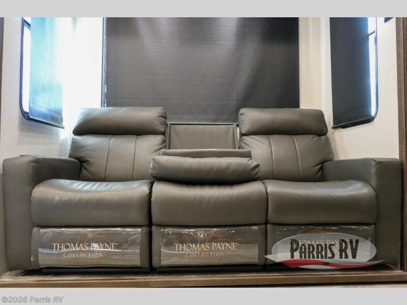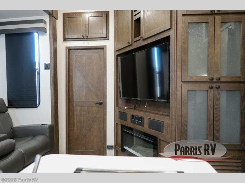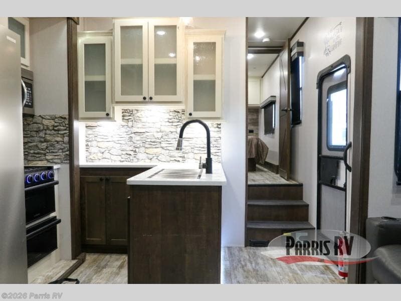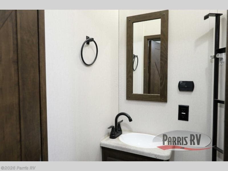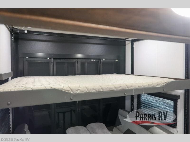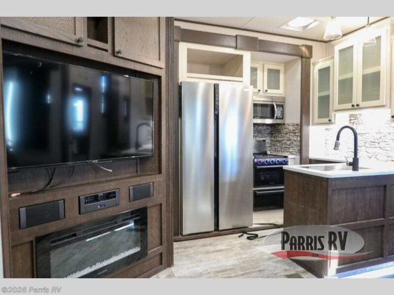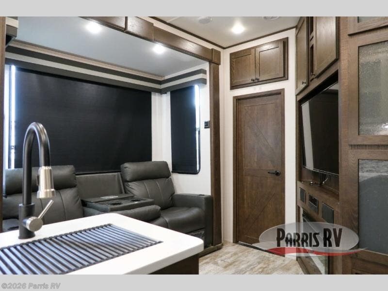 Everyone will enjoy the main living and kitchen area with a 50" TV and electric fireplace after a long day on the trails! You can relax on the sofa slide out while others take turns getting cleaned up in the full bathroom next to the front private bedroom with a king-size bed, and wardrobe slide out, or some might just need to wash their face and hands in the half bath off of the garage. The cook will love the kitchen with a peninsula countertop including a grate style sink with a cover/drying rack, plus the slide out with appliances. The garage offers 11' of cargo space, plus an electric bed with dual sofas and tables giving the kids their own space after the toys are unloaded.