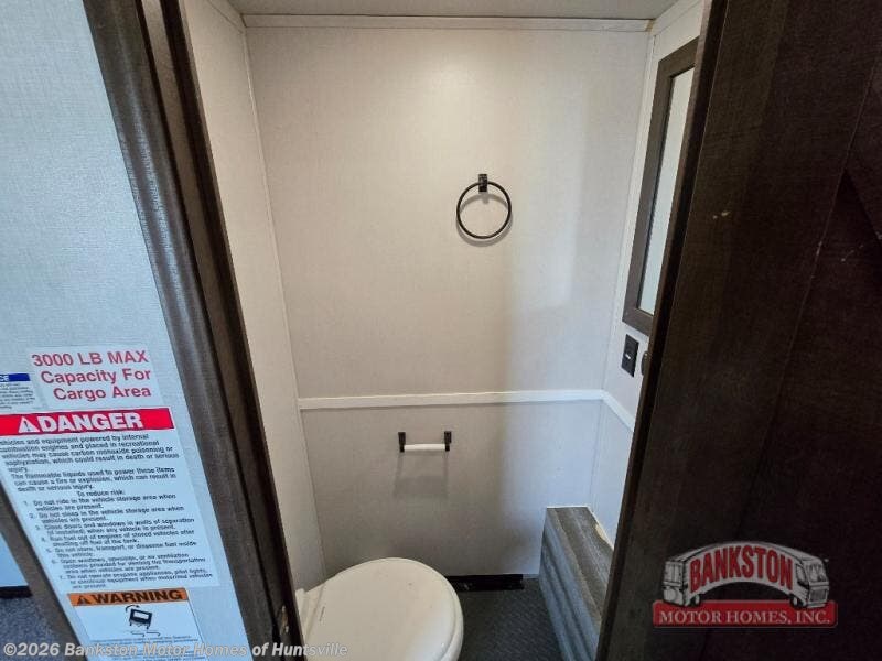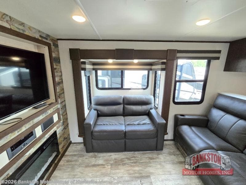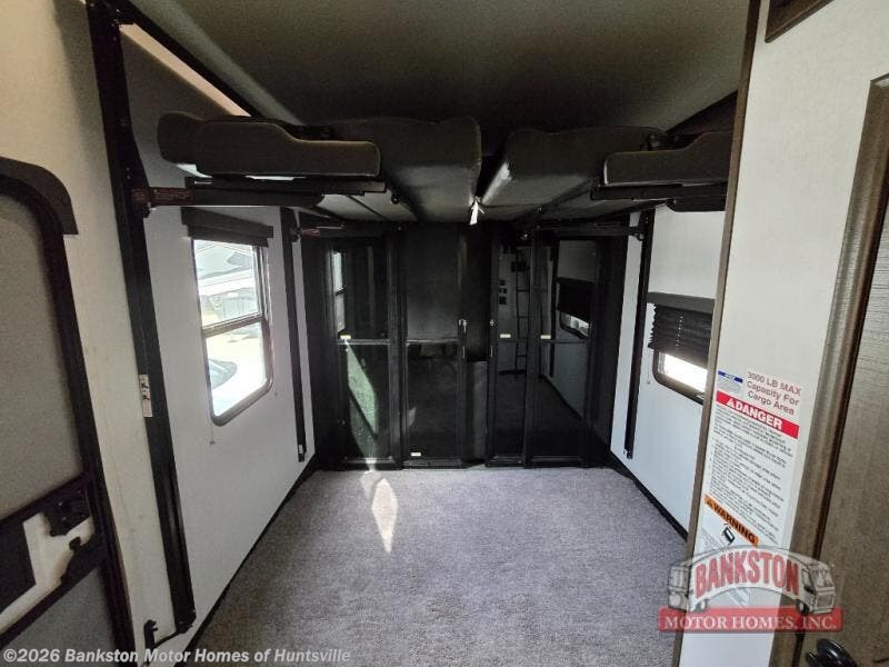 This fifth wheel toy hauler is popular for many reasons from the unique floorplan which offers a separate garage with a half bath, a side man door for easy access to your cargo, an electric queen bed with sofas and tables below plus 11' of cargo space to the walk-through bedroom with dual slides for more floor space, a queen size-bed and a full bathroom in the middle of the fifth wheel. The separate living area offers three sofas to relax on, an electric fireplace and 50" TV for inside entertainment, and the separate kitchen gives the cook lots of counter space, a window with a view, a residential refrigerator and microwave, plus more! You can even watch a game on the exterior TV while enjoying the great outdoors as you wait your turn on your toys or to get cleaned up in the shower with a seat.