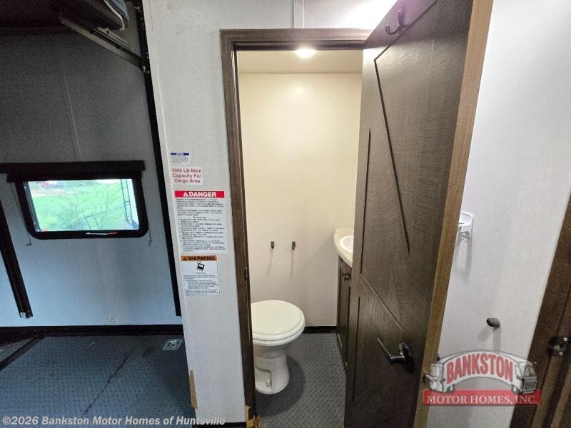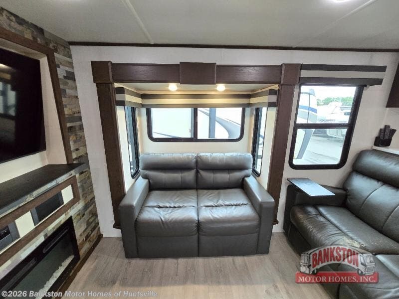This fifth wheel toy hauler is popular for many reasons from the unique floorplan which offers a separate garage with a half bath, a side man door for easy access to your cargo, an electric queen bed with sofas and tables below plus 11' of cargo space to the walk-through bedroom with dual slides for more floor space, a queen size-bed and a full bathroom in the middle of the fifth wheel. The separate living area offers three sofas to relax on, an electric fireplace and 50" TV for inside entertainment, and the separate kitchen gives the cook lots of counter space, a window with a view, a residential refrigerator and microwave, plus more! You can even watch a game on the exterior TV while enjoying the great outdoors as you wait your turn on your toys or to get cleaned up in the shower with a seat.