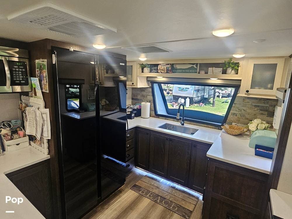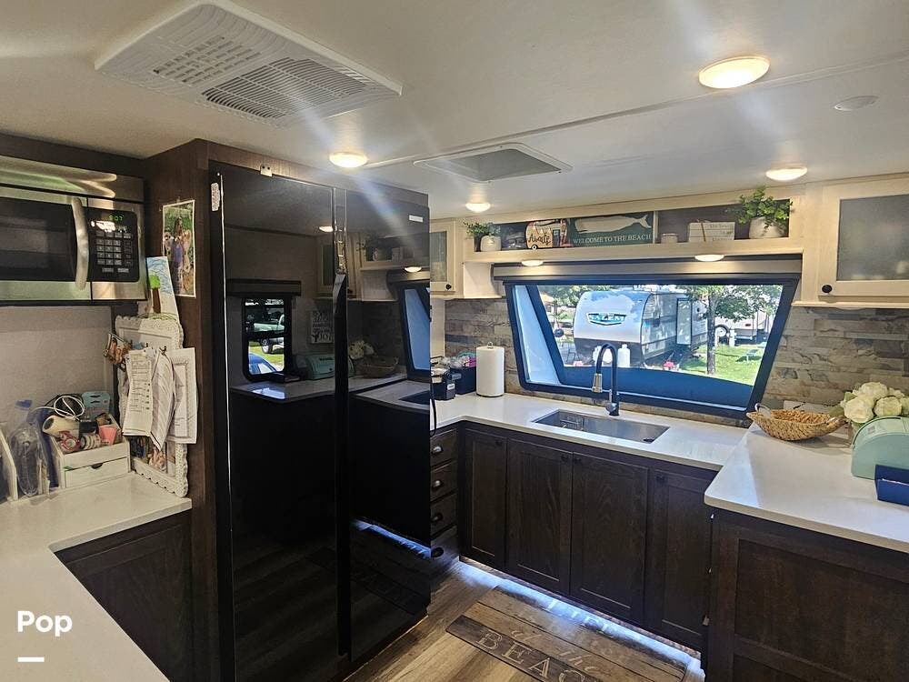 The kitchen is also open and spacious. It features ample cabinet space, a full-size refrigerator/freezer, a kitchen sink, and a microwave.