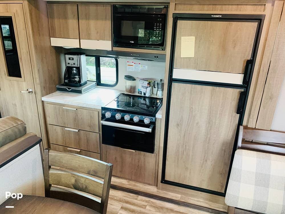 It features a well-equipped kitchen with ample storage space, a Furrion range and hood, a large pantry, and a flip-up counter extension.