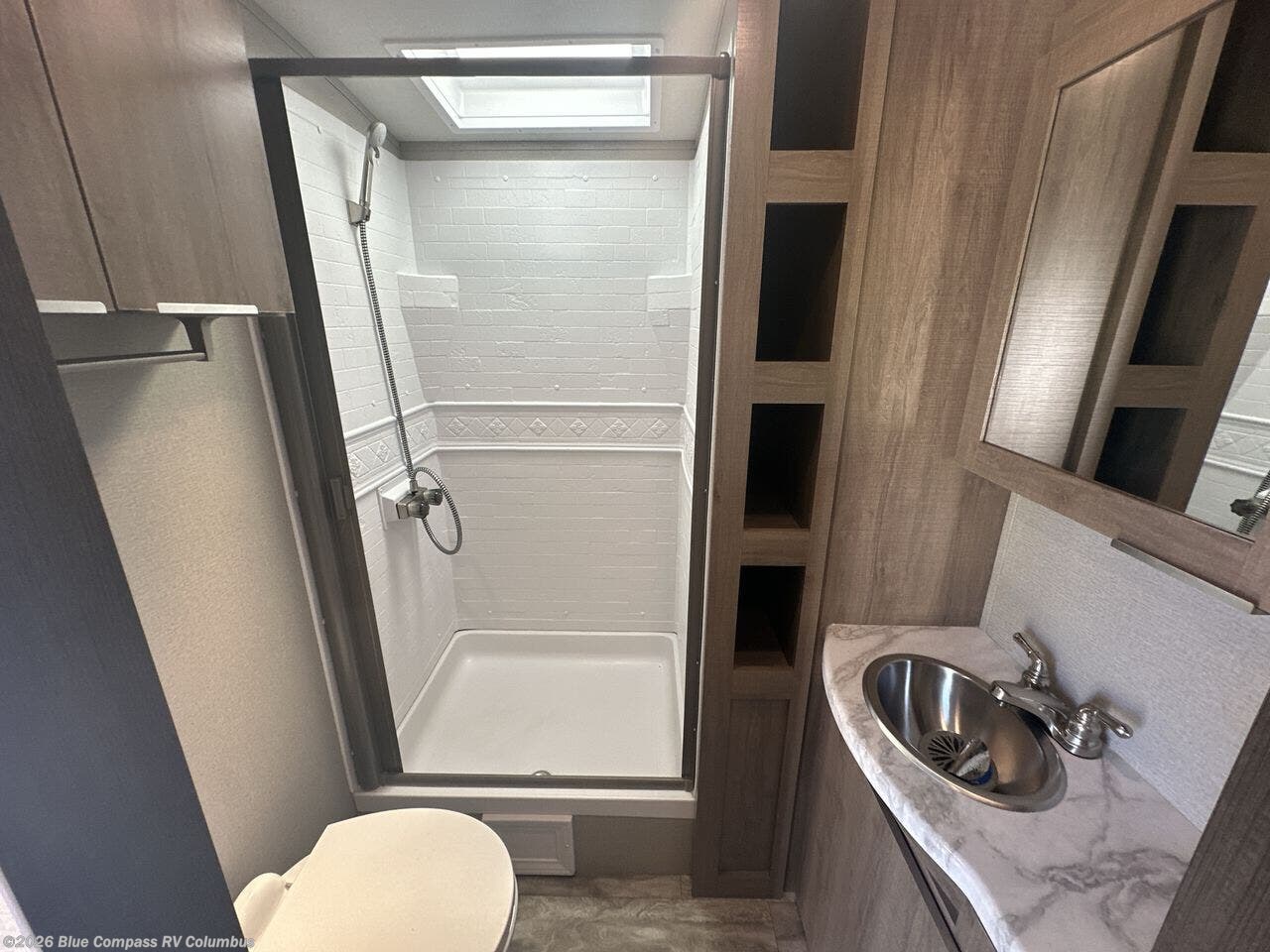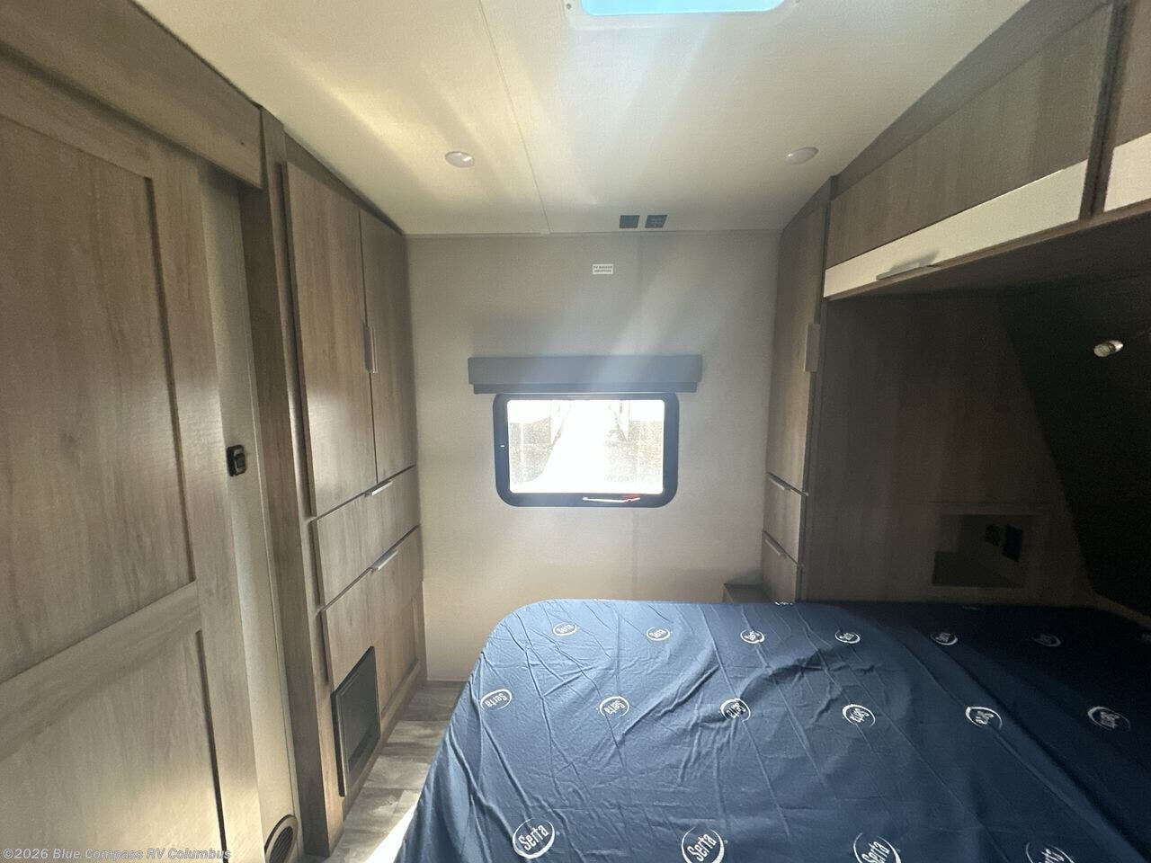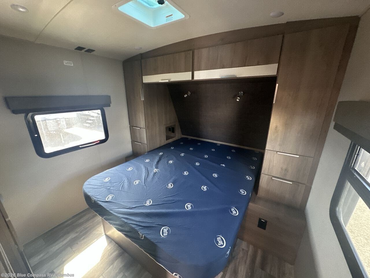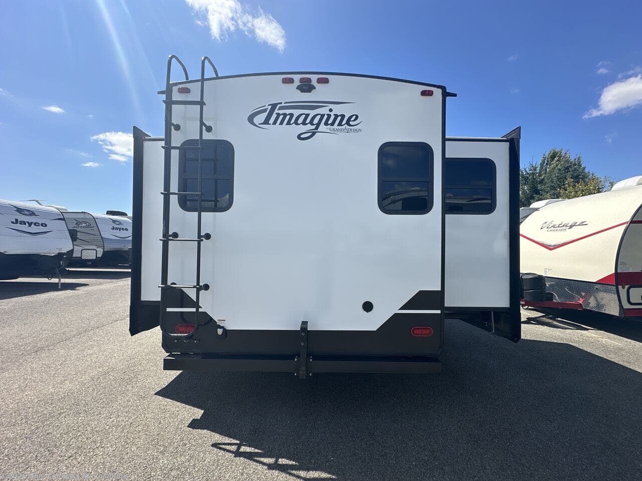 With any Imagine by Grand Design the construction includes a laminated aluminum framed main floor, rear wall, side walls, roof and end walls in the slide rooms and floors, plus a one-piece roof membrane giving you years of lightweight towing to your favorite destinations. Best in class storage is found in the exclusive drop frame unobstructed pass through storage, and the Universal Docking station offers an all-in-one location for utilities and hookups, plus you will find industry leading tank capacities and extended season camping with the mandatory four-season protection package. Inside you will experience residential cabinetry and a pull-down sprayer kitchen faucet, upgraded residential furniture and countertops, plus much more with an 81" radius ceiling for a spacious interior. Choose your favorite Imagine today, and start adventuring in a lightweight and comfortable trailer!- Front Bedroom