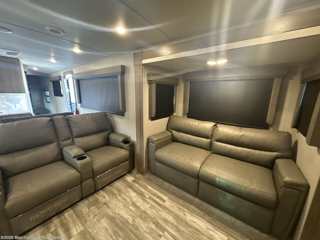If you enjoy entertaining, this trailer will be perfect for just that with a rear wall that includes a 50" LED HDTV with a fireplace below and windows on each side. There are two tri-fold sofas within slide outs offering lots of floor space, and theater seating with cupholders that separates this area from the kitchen. Everyone can enjoy the big game while the cook makes snacks or a meal using all the appliances. Some might enjoy playing a game of cards at the free standing dinette with two folding chairs. The full bathroom offers a shower with skylight for more headroom and natural lighting, while your master suite provides three wardrobes, a walk-around queen bed, and windows to brighten your day.