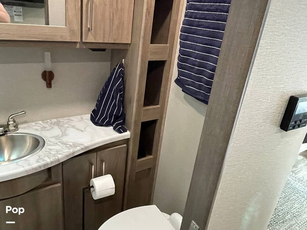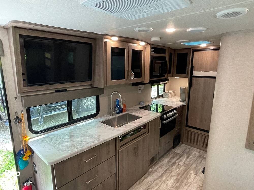 Comfort in any weather is no problem here. The 13,500 BTU ducted air conditioning keeps you cool on hot summer days, and the propane heating system takes care of chilly nights. The private bathroom with a separate shower and skylight, linen storage, and overhead cabinet rounds out a very livable, well-organized floor plan that punches well above its weight class.
