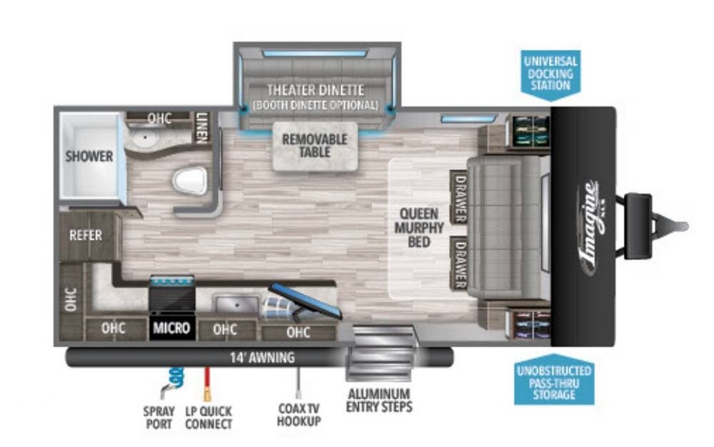 The Theater Dinette is the heart of the trailer's social space. With its angled, stadium-style seating and removable table, it's the perfect spot to enjoy a meal, play games with the family, or just kick back and relax after a long day of exploring. The built-in Bluetooth stereo and TV antenna with coax hookup mean you'll have no shortage of entertainment options, no matter where you park.