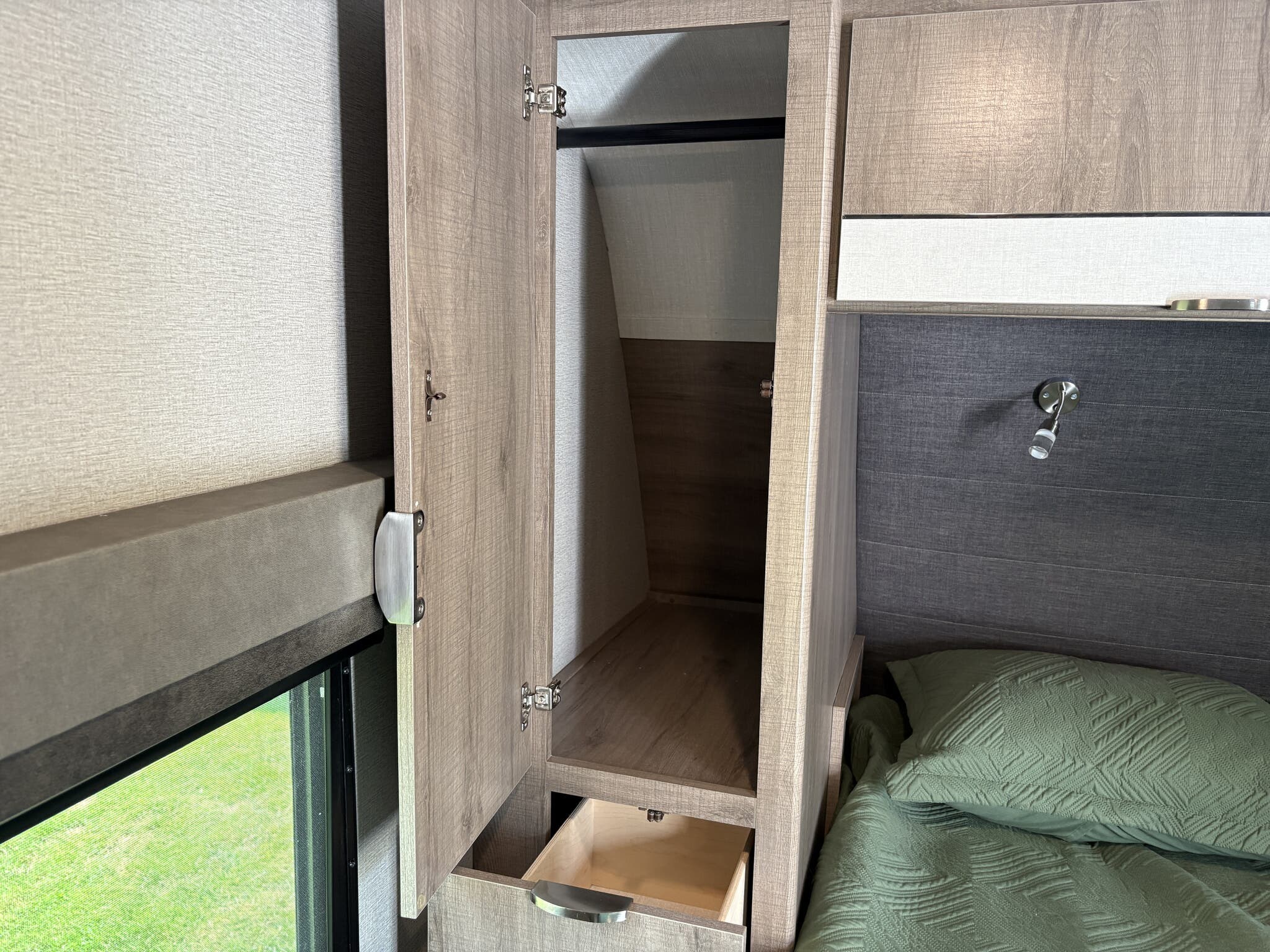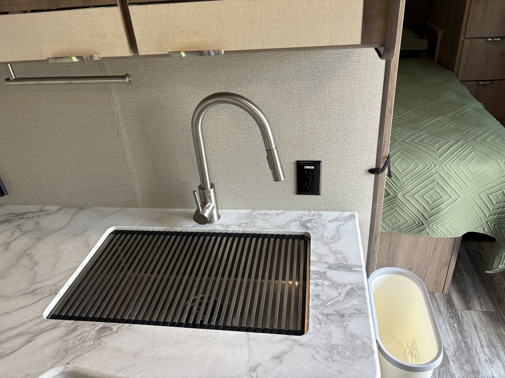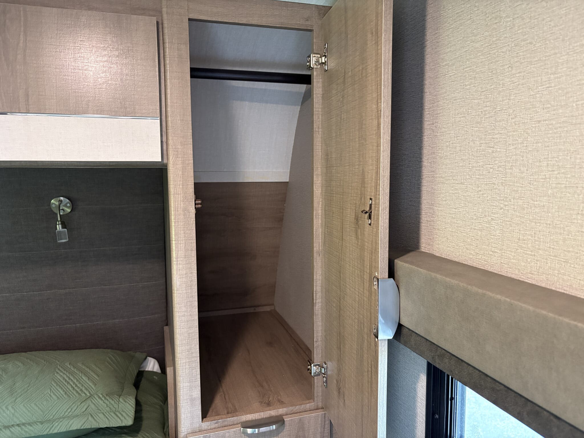 The travel trailer is built for durability and ease of use, featuring a spare tire kit and exterior speakers for outdoor gatherings. The RV’s exterior is designed with functionality in mind, making it an ideal choice for those looking to blend comfort, safety, and style in their next adventure.