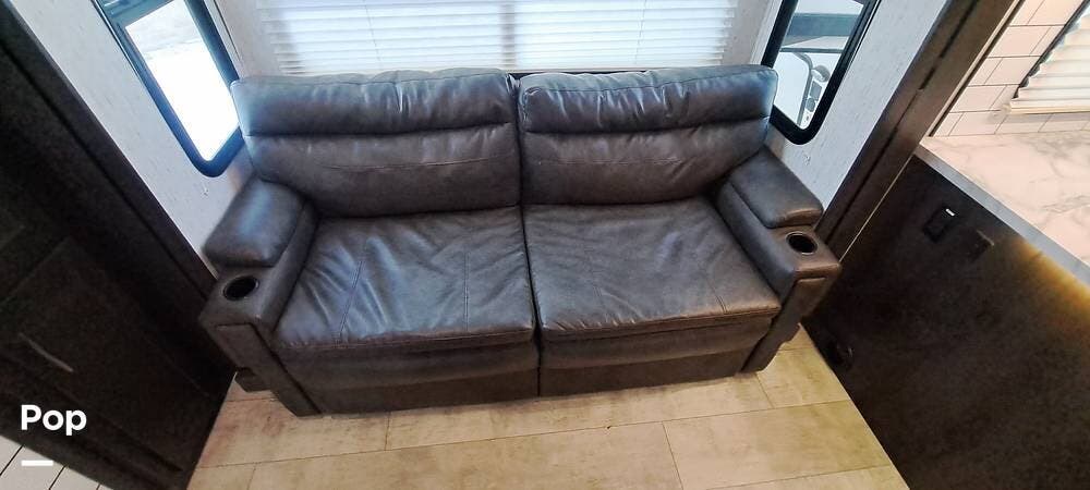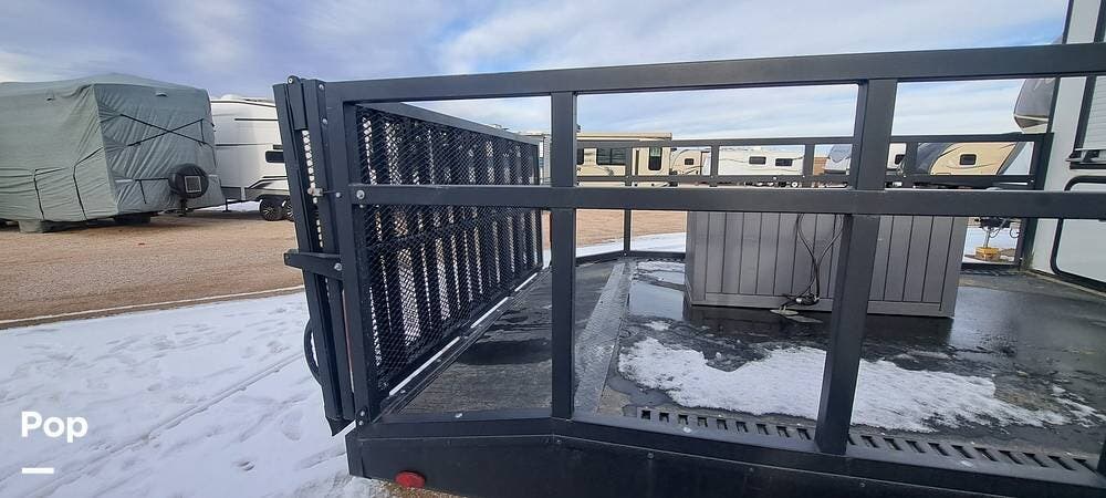 Inside, you'll find a well-appointed living area with a reclining sofa, large entertainment setup, and a fully equipped kitchen featuring quality appliances and generous counter space. The separate garage doubles as a flexible living or sleeping space, with tie-downs, a rear ramp/patio system, and convertible seating to adapt to your needs. A private front bedroom with a walk-around queen bed and a roomy bathroom completes the comfortable, functional layout.