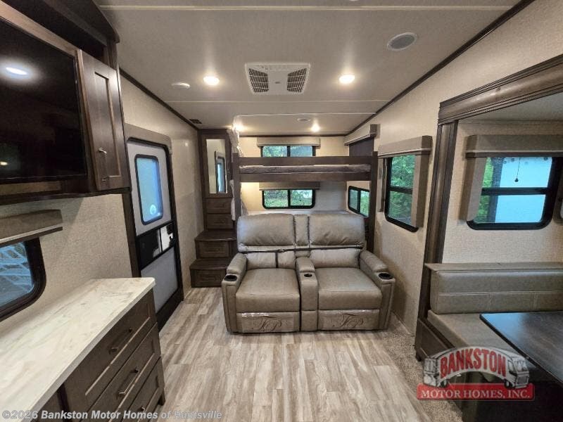 You will find plenty of storage for your clothing and such inside this Reflection 150 Series fifth wheel. Plus, the exterior also offers storage space with the rear storage and unobstructed pass-through compartment, so you can bring the outdoor games, camping chairs, charcoal, and fishing poles. The kids will love having their own bunk, a wardrobe, and step storage while you have your own space in the front master bedroom. The bedroom contains a walk-around queen bed and a space-saving sliding door. The main living area is spacious with the slide out, and you can relax on the theater seating. The U-shaped dinette also offers plenty of space for playing games as well.