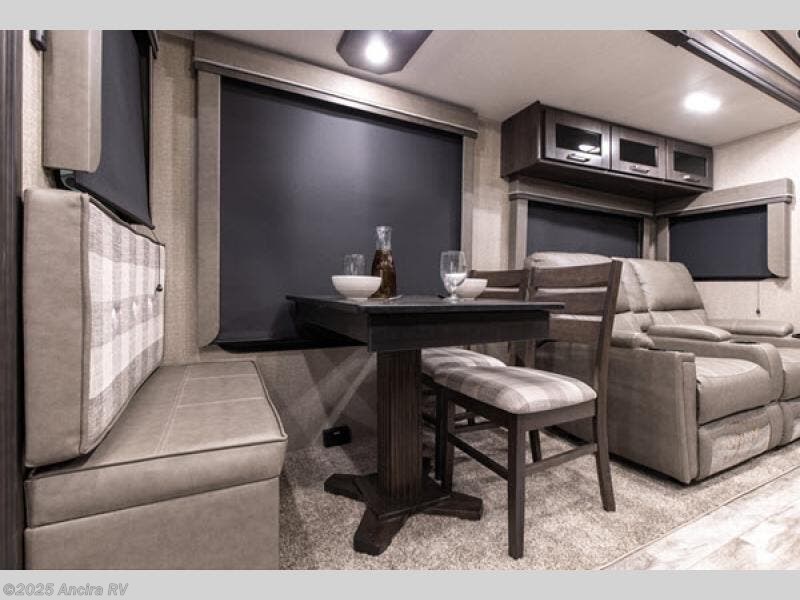 Pack your bags and head out on a luxurious camping trip with this fifth wheel! The rear living area is the perfect place to wind down your nights by relaxing on either the rear tri-fold sofa or the theater seating directly across from the entertainment center with a 40" HDTV and a fireplace. The kitchen island will make meal prepping easier and the hutch is the perfect place to store your nice dishes, plus the pantry is big enough to store all of your favorite snacks. There is a slide that extends in between the front private bedroom and the dual entry bathroom which has a linen closet, a wardrobe, and drawers to store your towels and clothes!