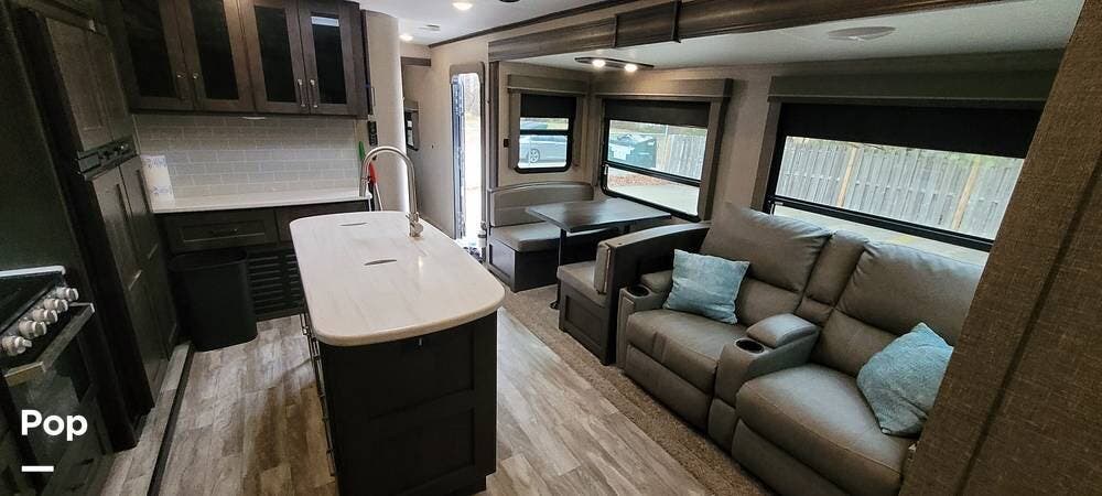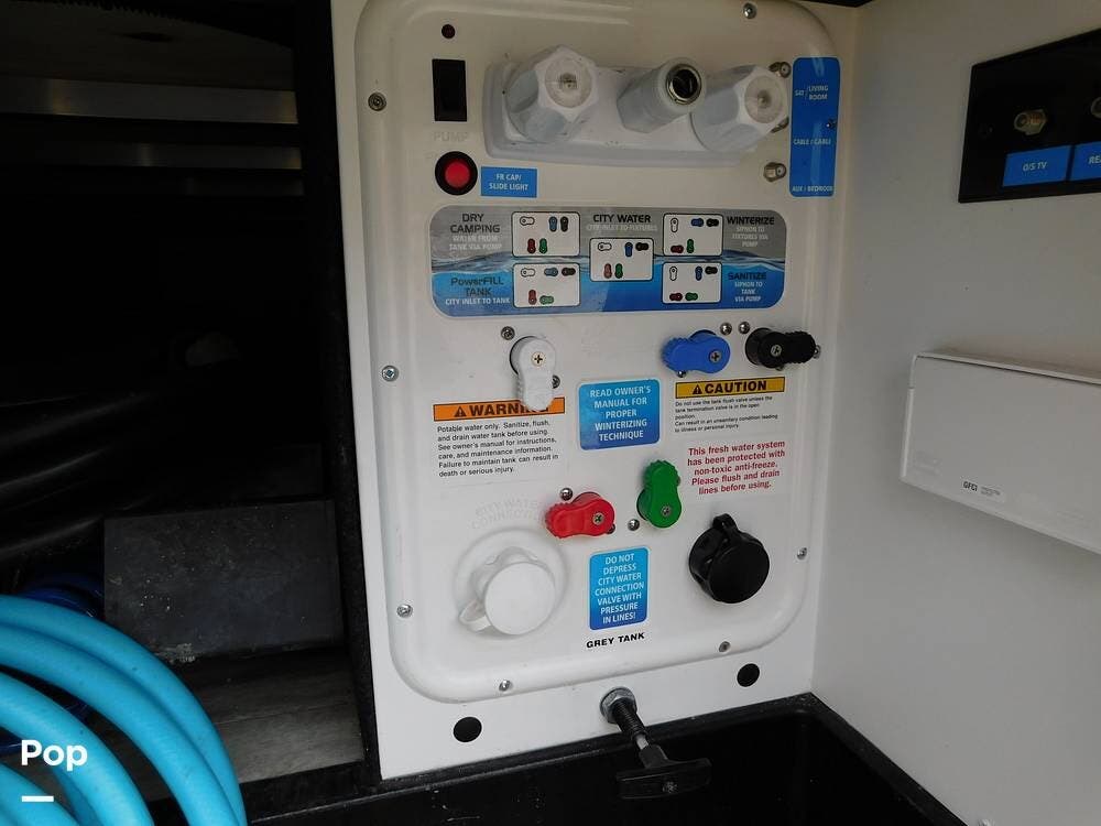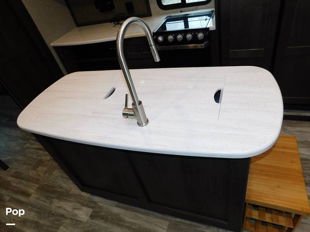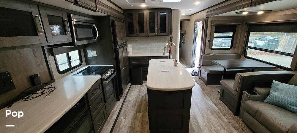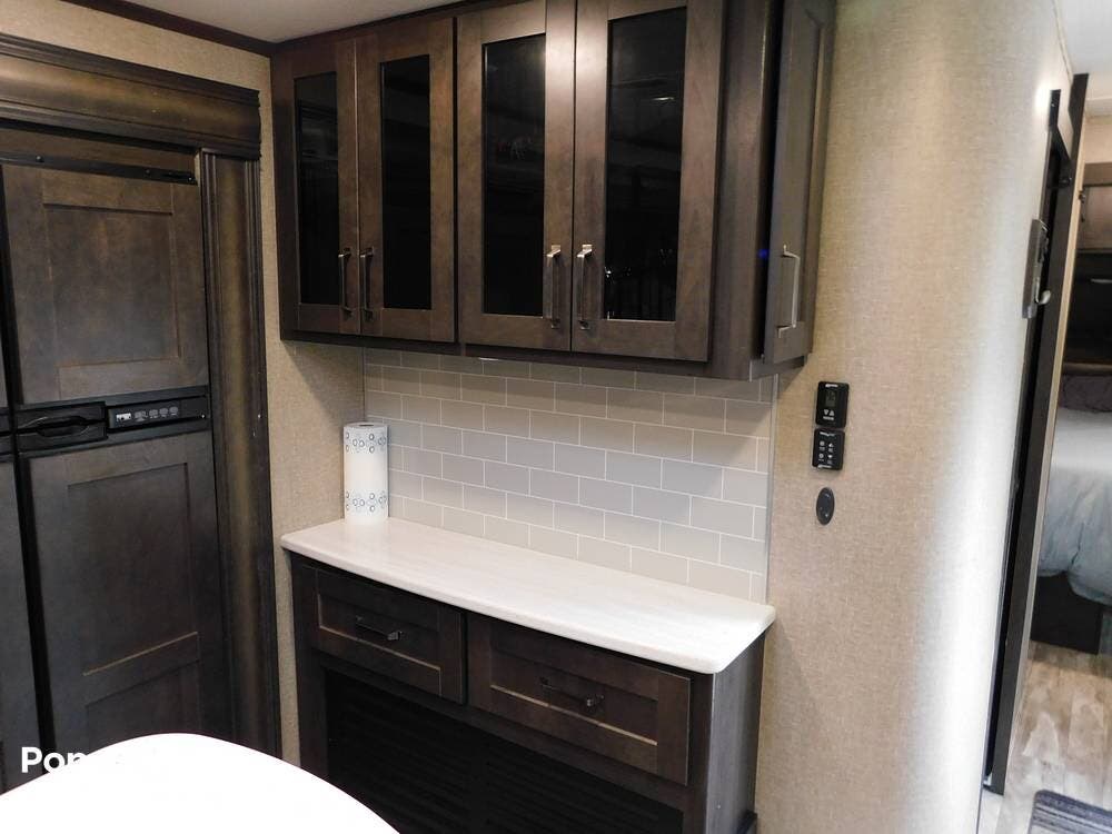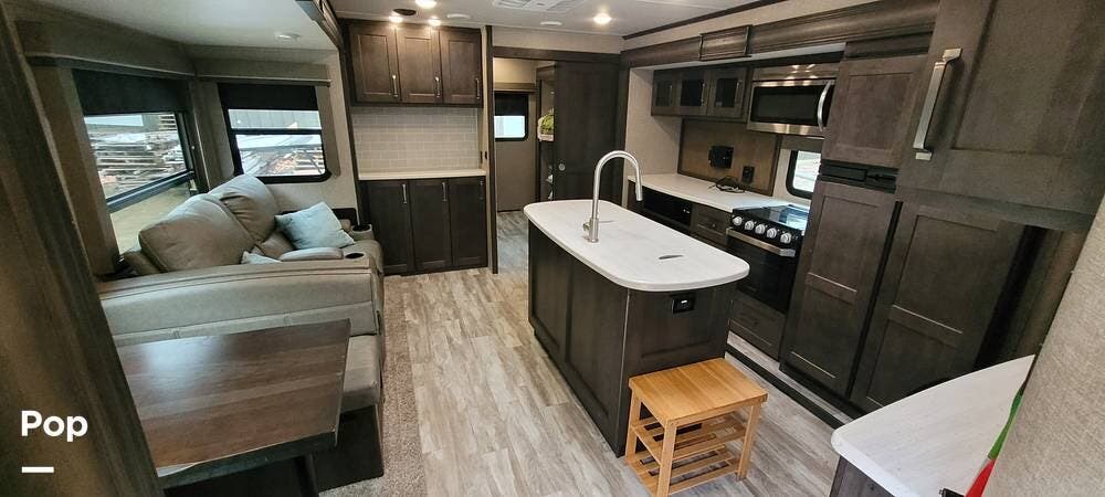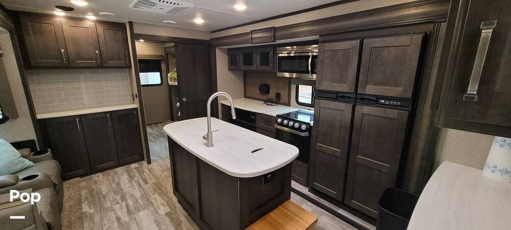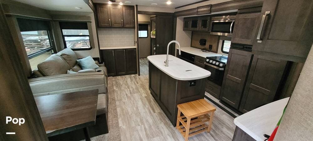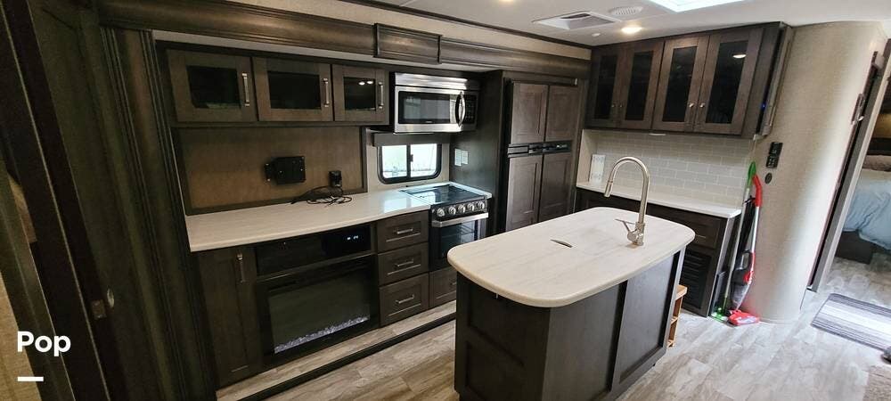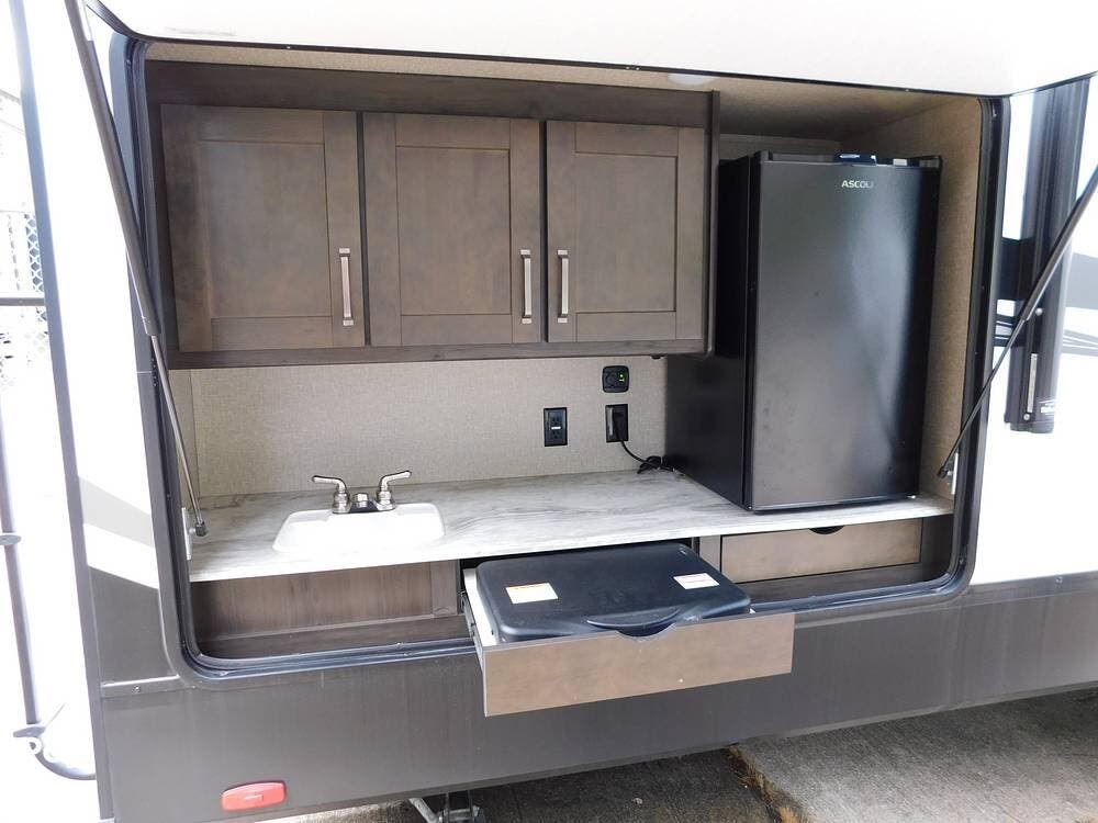 Starting with the exterior of this RV, it has JT struts, a power tongue jack, aluminum wheels, power jacks, pass-through storage, cable/satellite hookup, and the EXTERIOR KITCHEN! Bring your propane grill, because this rig has a plug-and-play propane hookup right by the exterior kitchen. This unit has an extra-long 21-foot awning with LED lighting and is prewired for a backup camera. The seller had slide-out toppers installed on the driver's side slides as well.