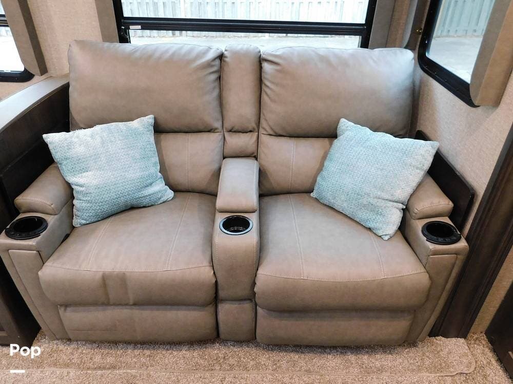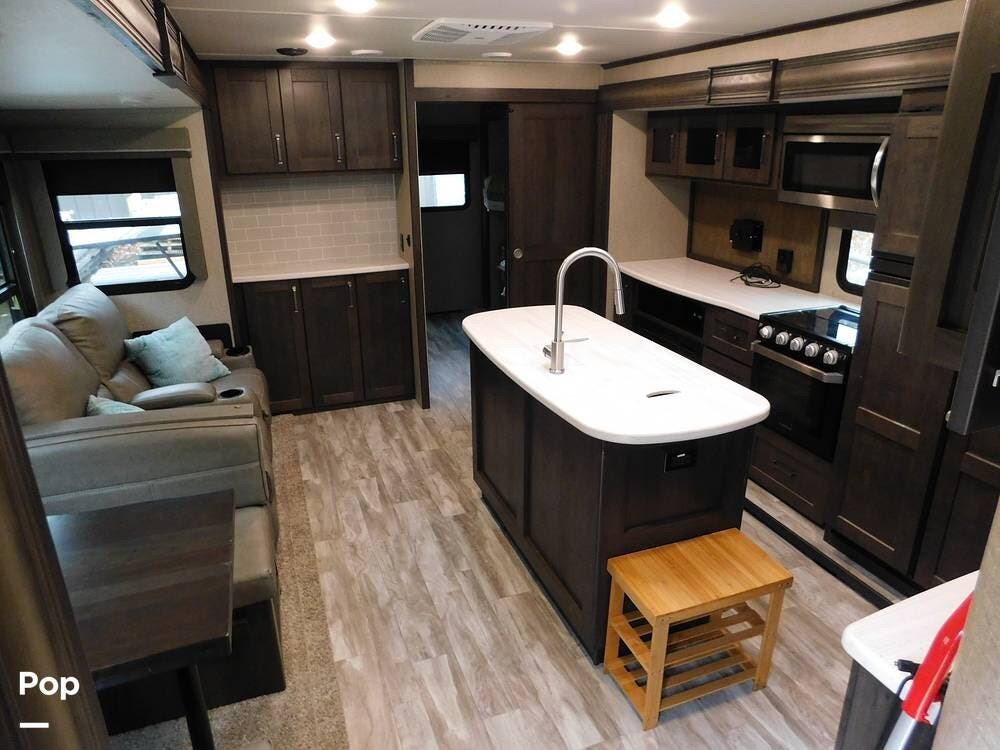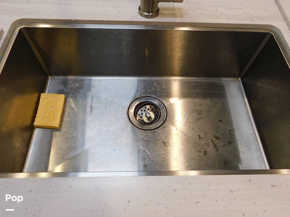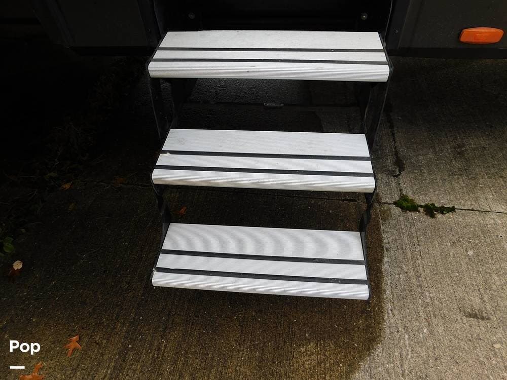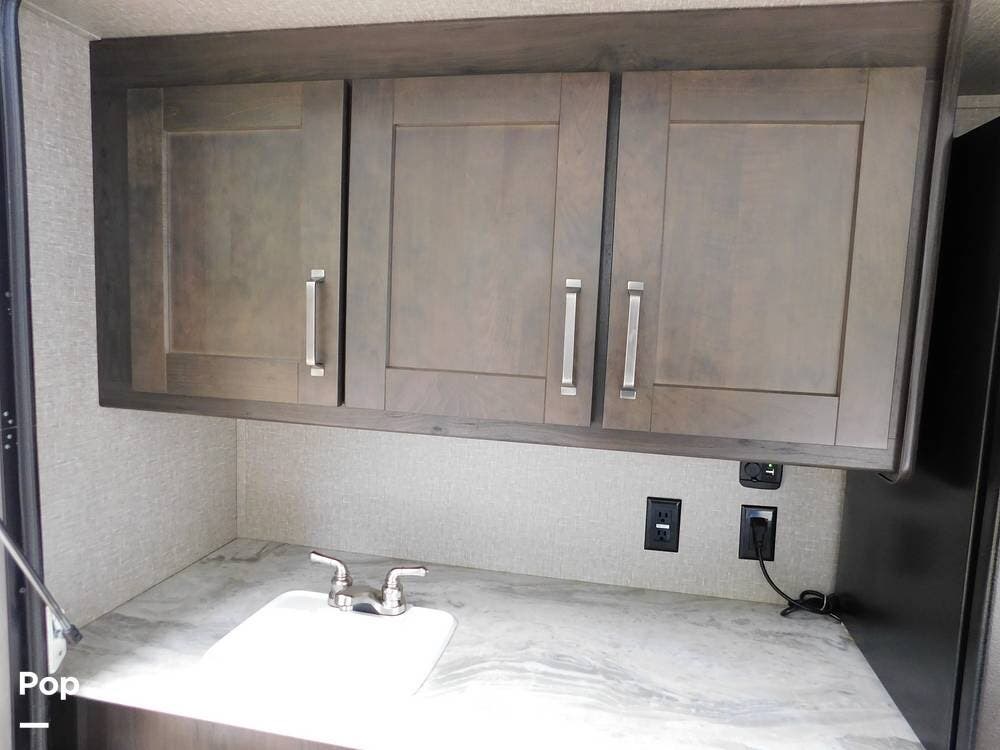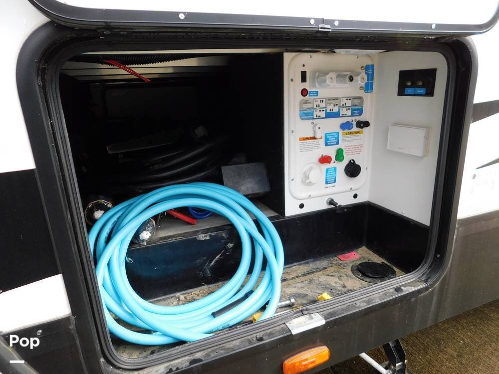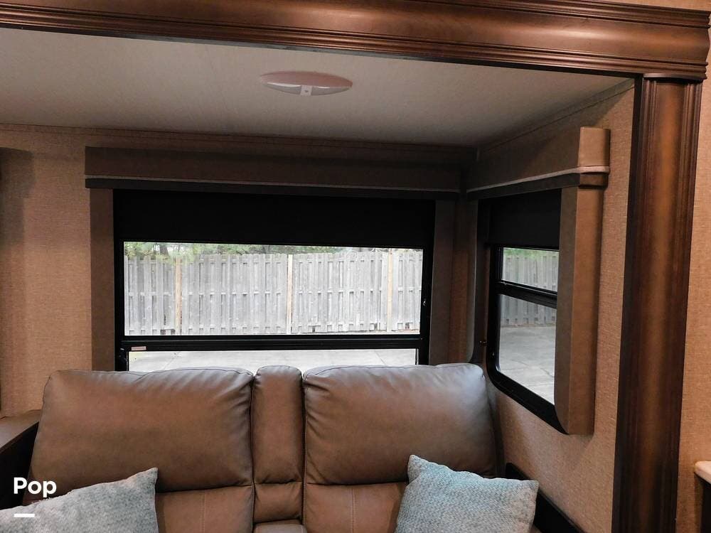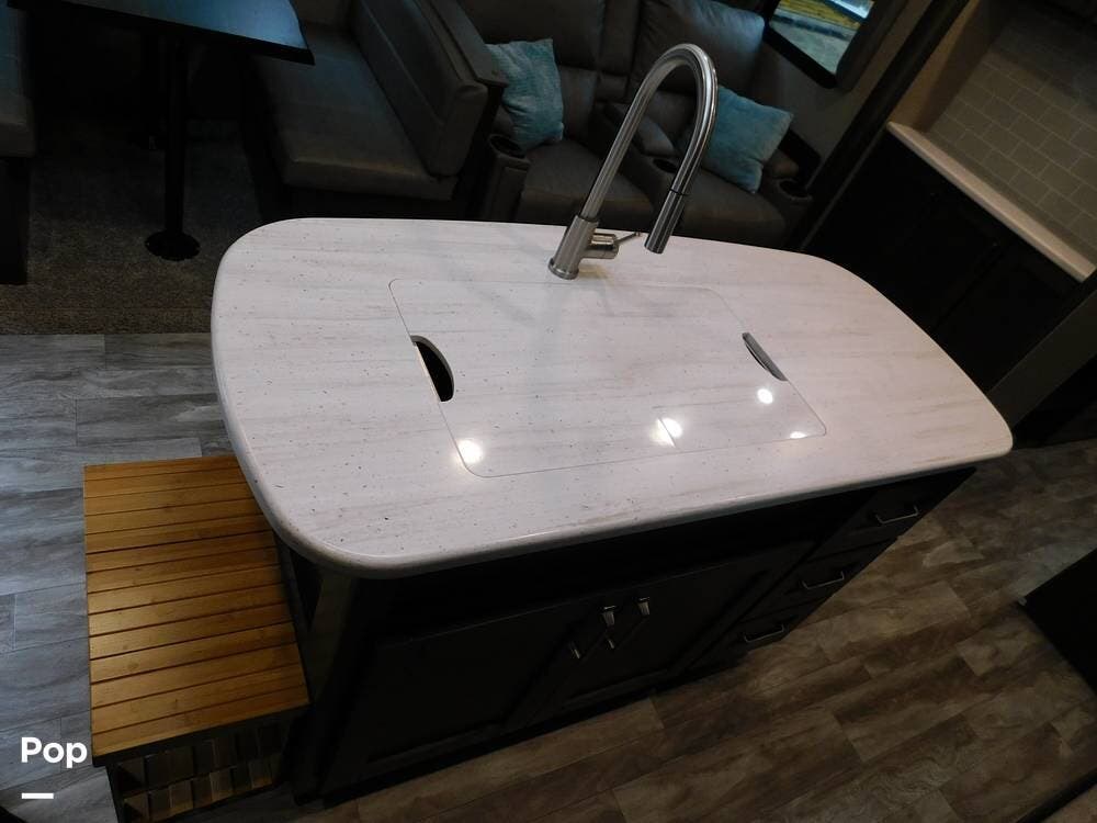 Starting with the exterior of this RV, it has JT struts, a power tongue jack, aluminum wheels, power jacks, pass-through storage, cable/satellite hookup, and the EXTERIOR KITCHEN! Bring your propane grill, because this rig has a plug-and-play propane hookup right by the exterior kitchen. This unit has an extra-long 21-foot awning with LED lighting and is prewired for a backup camera. The seller had slide-out toppers installed on the driver's side slides as well.