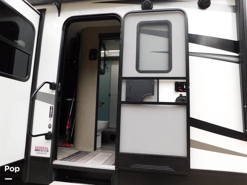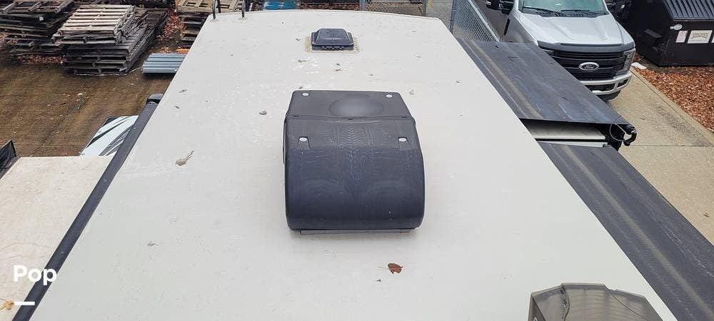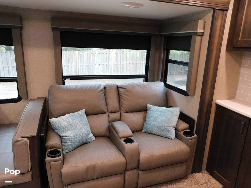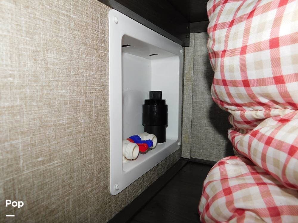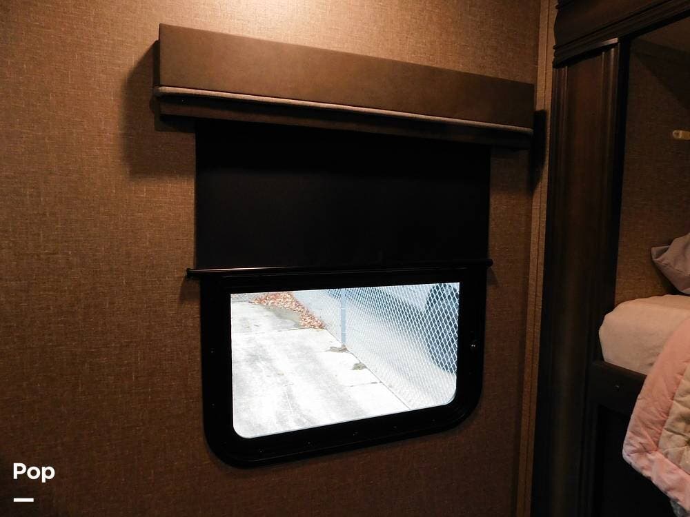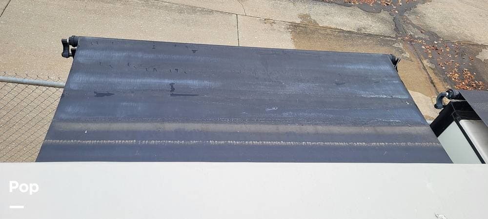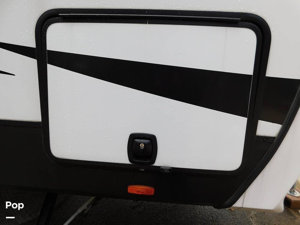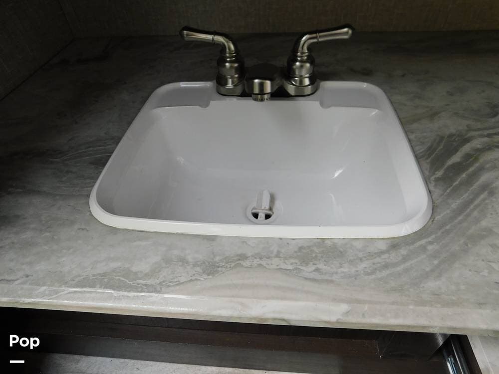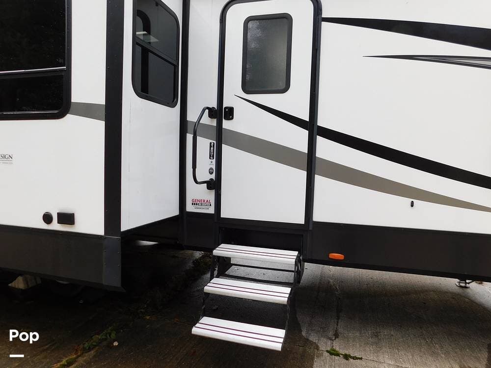 Starting with the exterior of this RV, it has JT struts, a power tongue jack, aluminum wheels, power jacks, pass-through storage, cable/satellite hookup, and the EXTERIOR KITCHEN! Bring your propane grill, because this rig has a plug-and-play propane hookup right by the exterior kitchen. This unit has an extra-long 21-foot awning with LED lighting and is prewired for a backup camera. The seller had slide-out toppers installed on the driver's side slides as well.