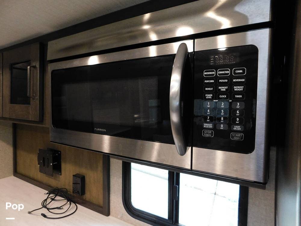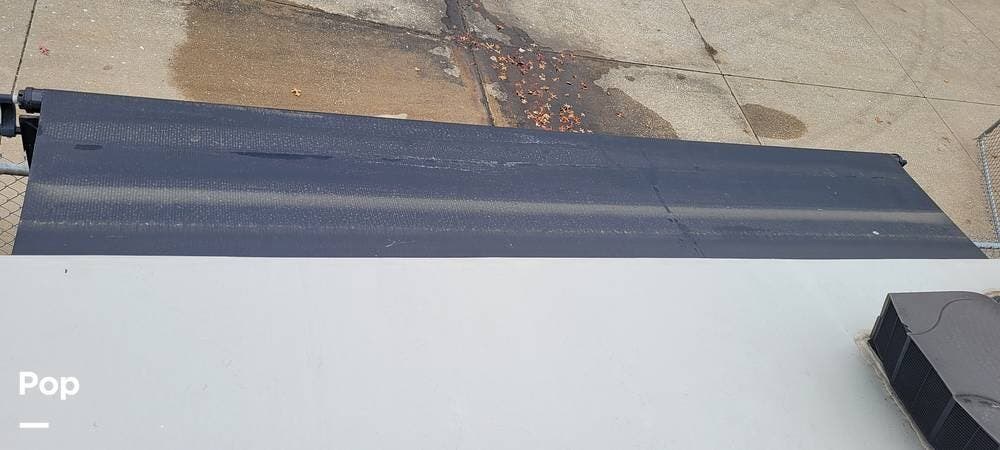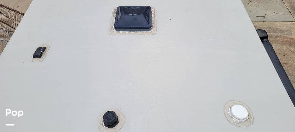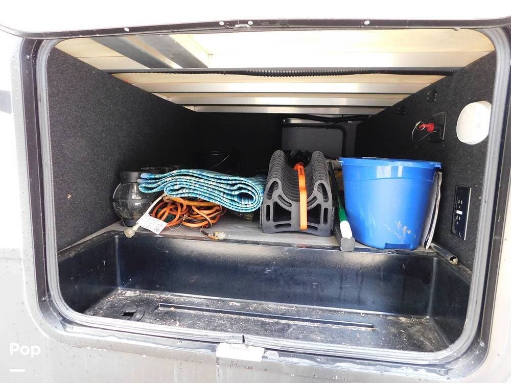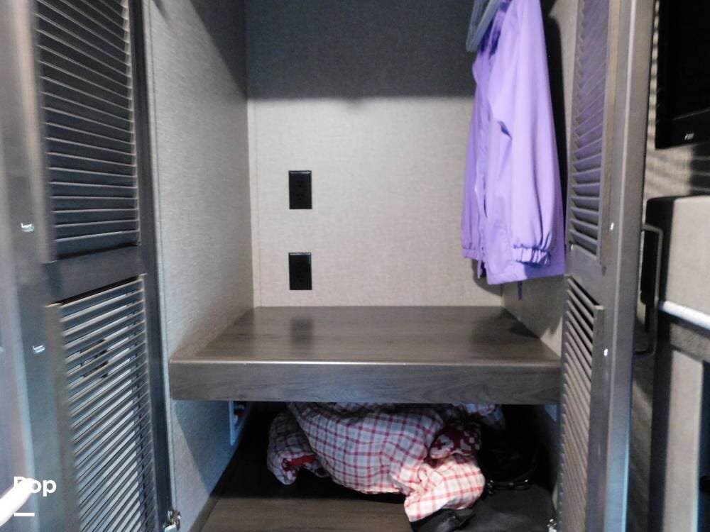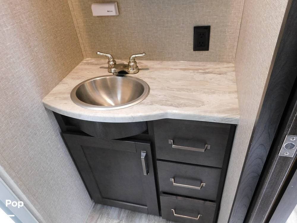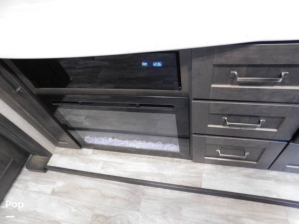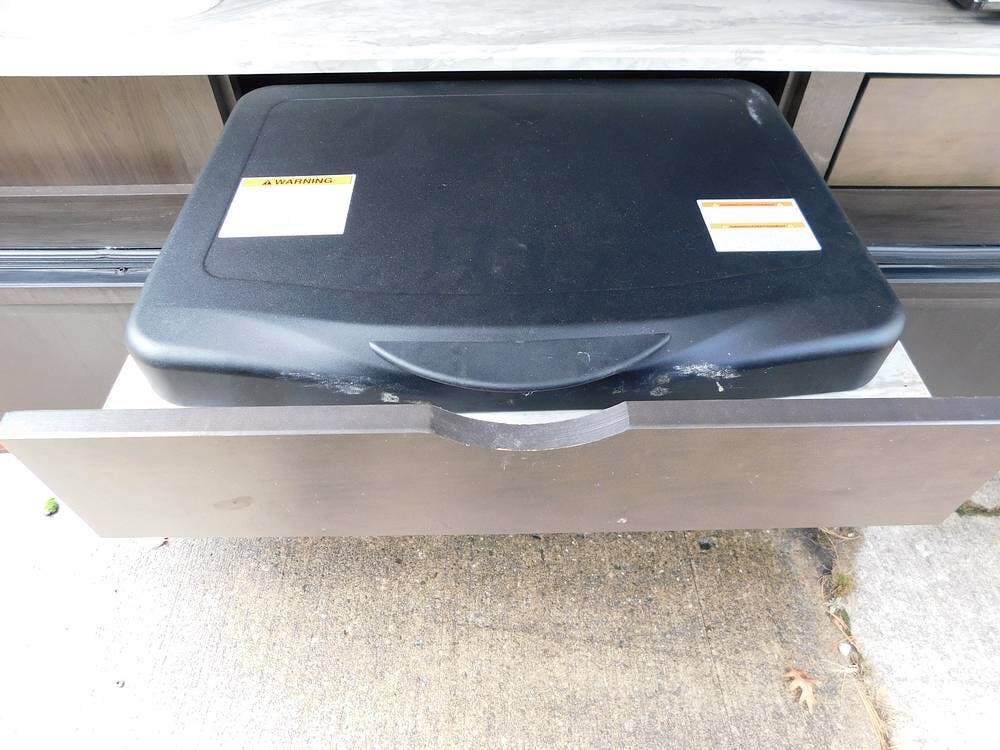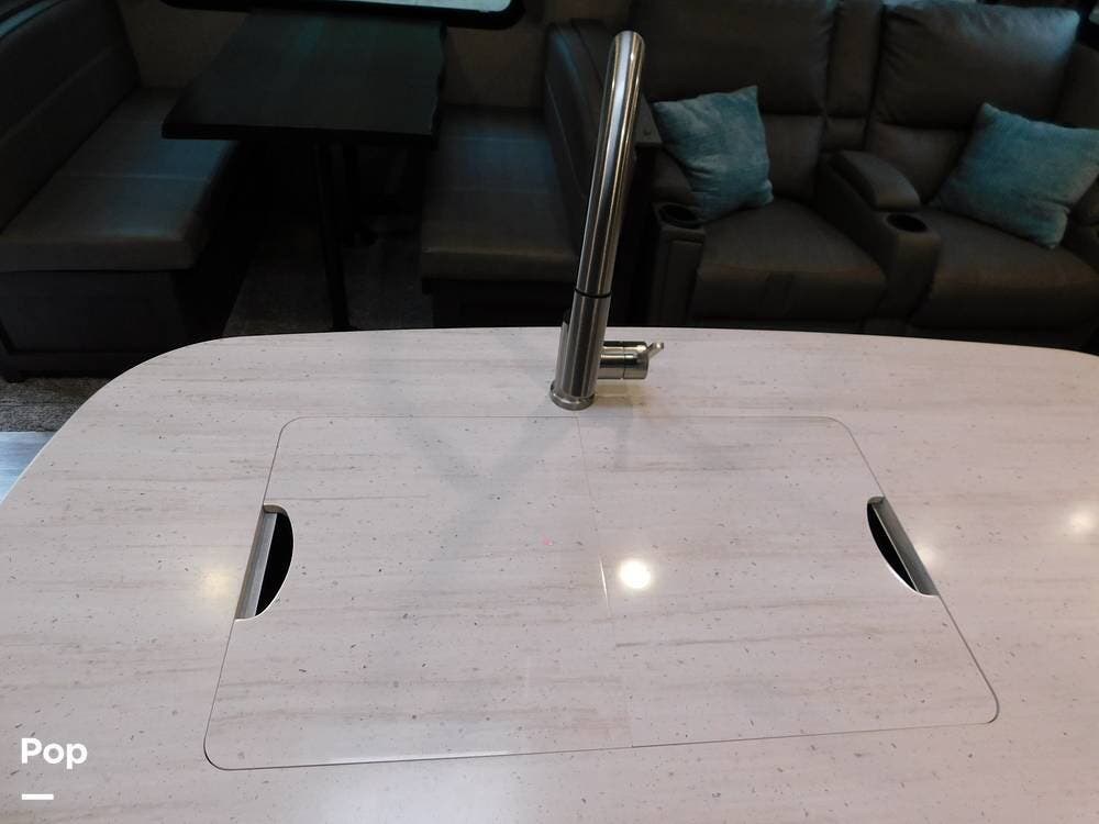 Starting with the exterior of this RV, it has JT struts, a power tongue jack, aluminum wheels, power jacks, pass-through storage, cable/satellite hookup, and the EXTERIOR KITCHEN! Bring your propane grill, because this rig has a plug-and-play propane hookup right by the exterior kitchen. This unit has an extra-long 21-foot awning with LED lighting and is prewired for a backup camera. The seller had slide-out toppers installed on the driver's side slides as well.