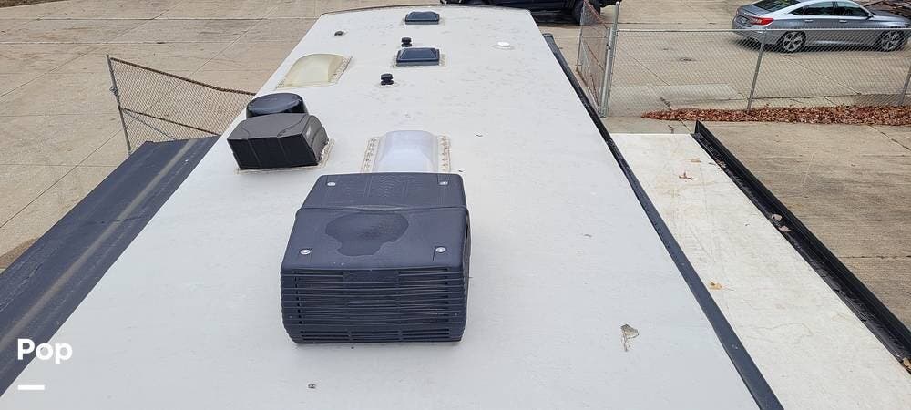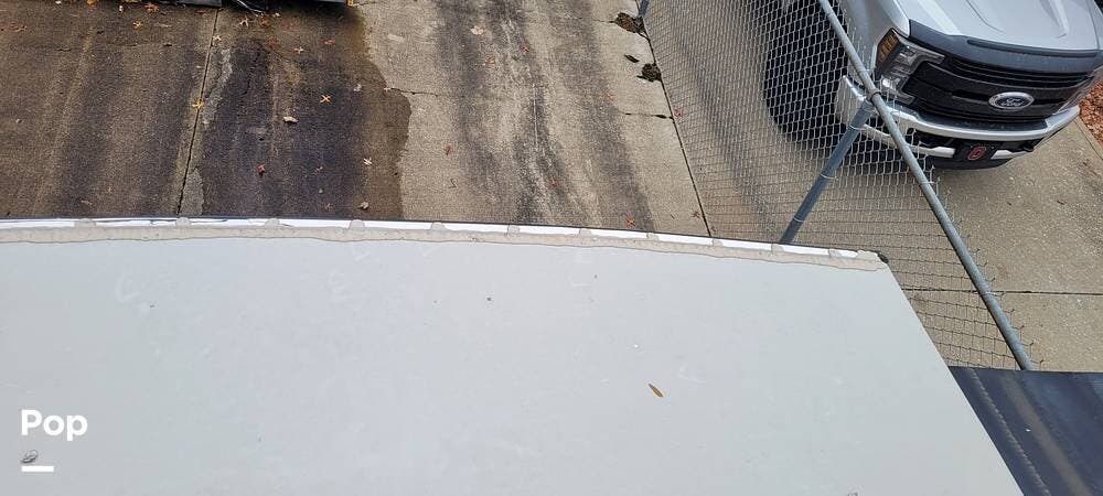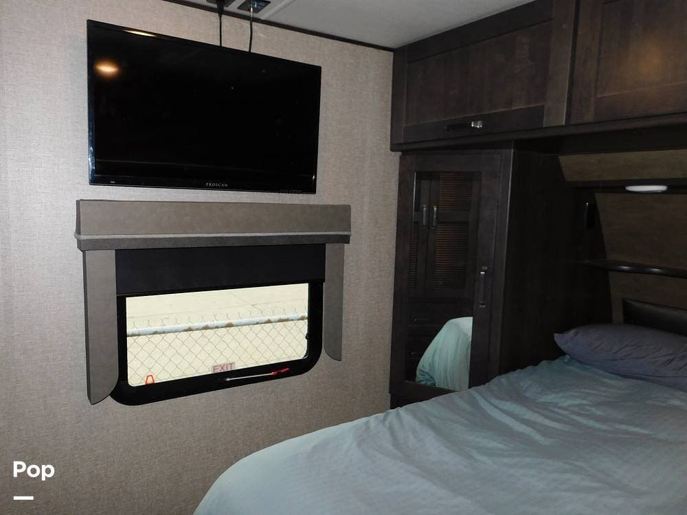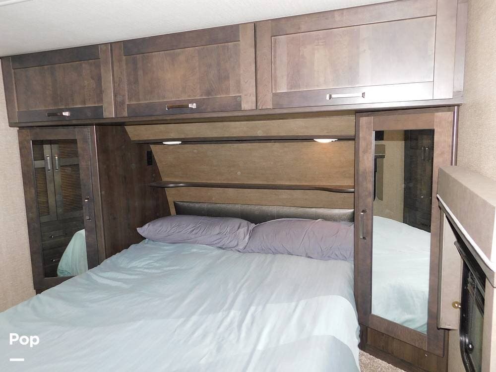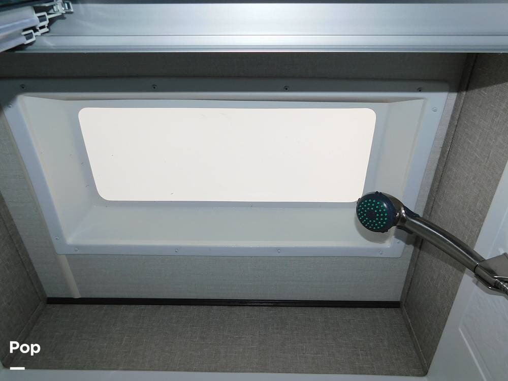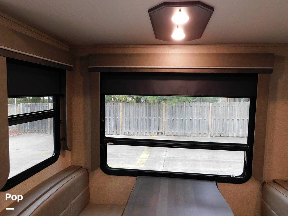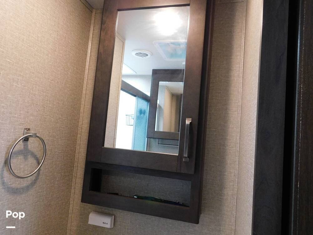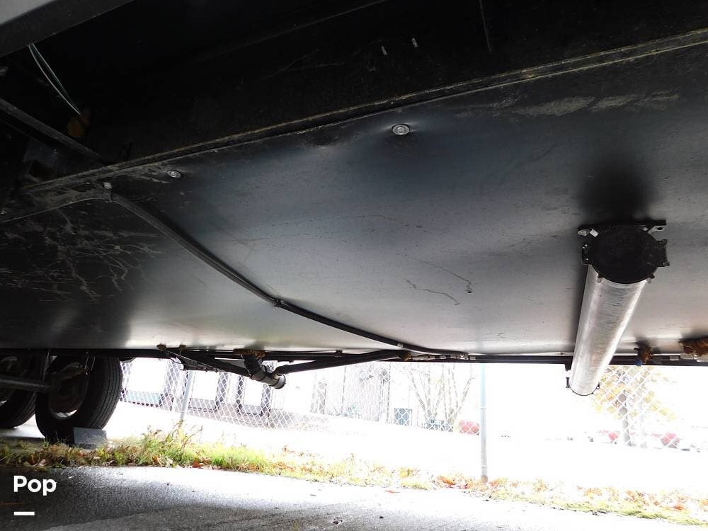 Starting with the exterior of this RV, it has JT struts, a power tongue jack, aluminum wheels, power jacks, pass-through storage, cable/satellite hookup, and the EXTERIOR KITCHEN! Bring your propane grill, because this rig has a plug-and-play propane hookup right by the exterior kitchen. This unit has an extra-long 21-foot awning with LED lighting and is prewired for a backup camera. The seller had slide-out toppers installed on the driver's side slides as well.