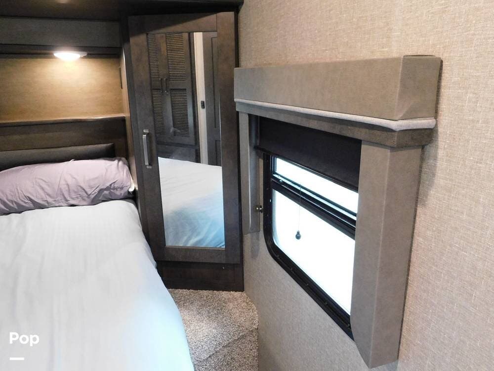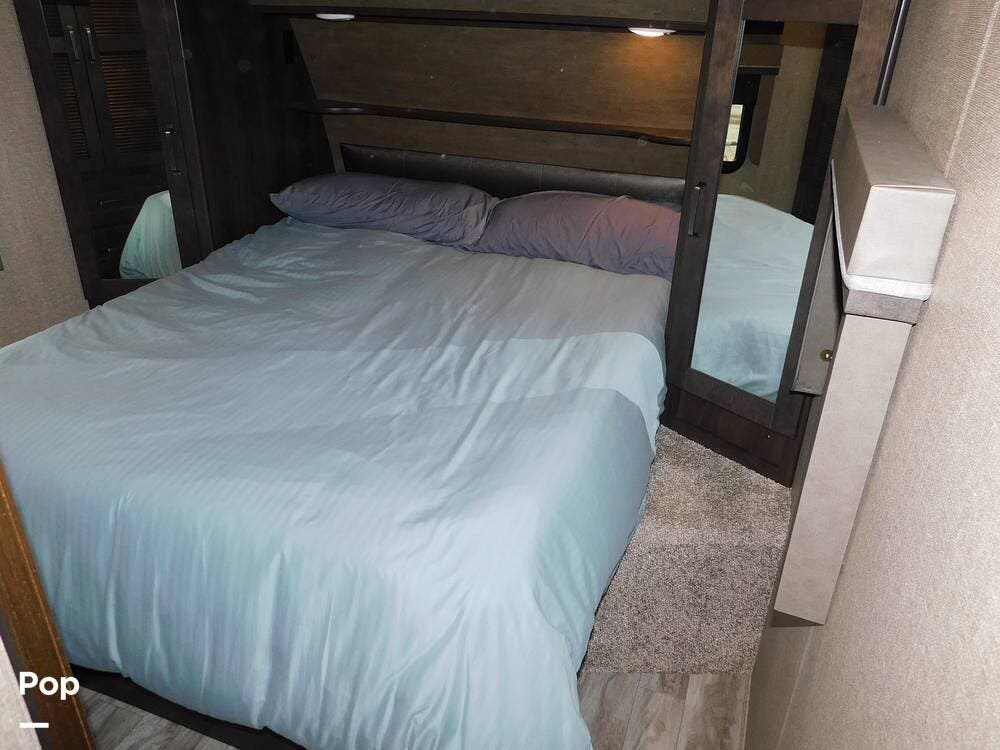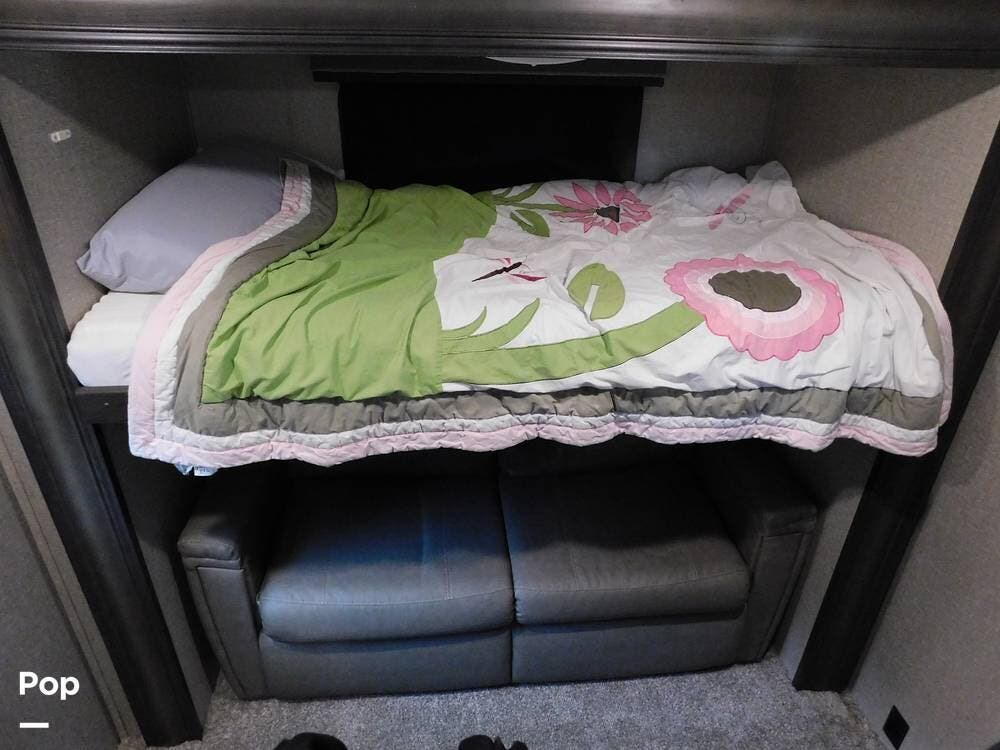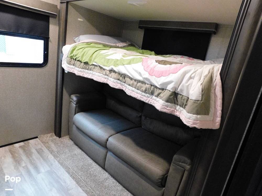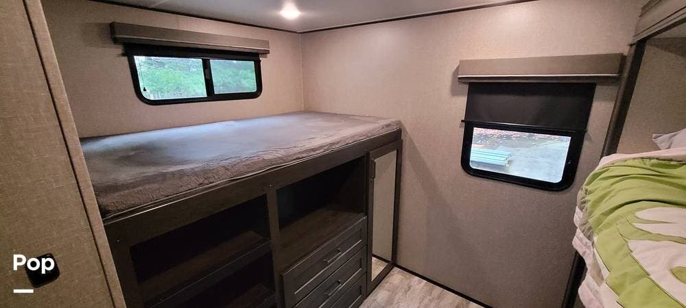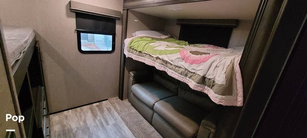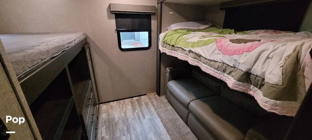 Now let's head inside and discuss some of the great features of this rig. First off, the friction hinge door won't smack you as you enter. Let's head to the bunk room, which has a full-size bunk bed on one side with ample storage underneath, prewired for a TV, and with USB ports. On the other side, you have an additional bunk with a sleeper sofa underneath. The bunkhouse has more windows than the norm, with one on each side and one at the rear.
