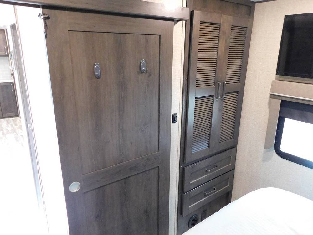 On to the owner's suite with a queen-size bed, tons of storage, and hanging closets on either side of the bed. Reading lights above the bed with USB ports and 110 plugs. Plus, an additional storage area at the foot of the bed that has washer/dryer prep.