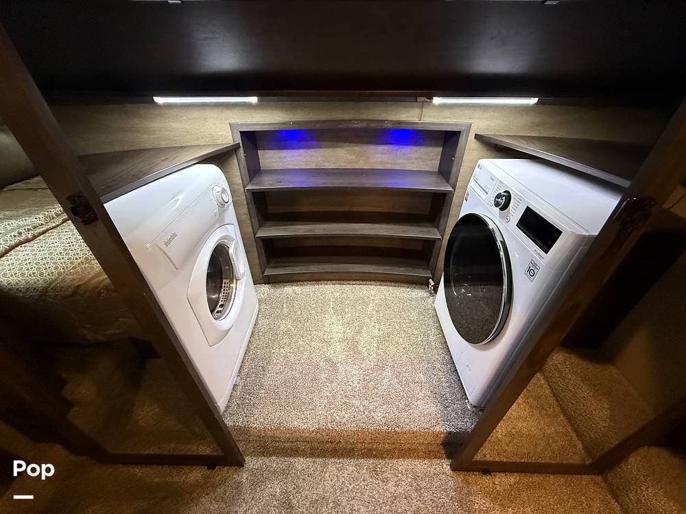 Inside, it features a washer and dryer, a queen-size bed with under-bed storage, two TVs, a fireplace, LED lighting in both the interior and exterior, modern and stylish overhead lighting, a sleep sofa, and dual reclining theater seating.