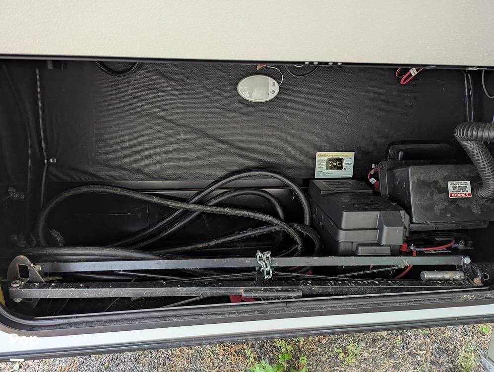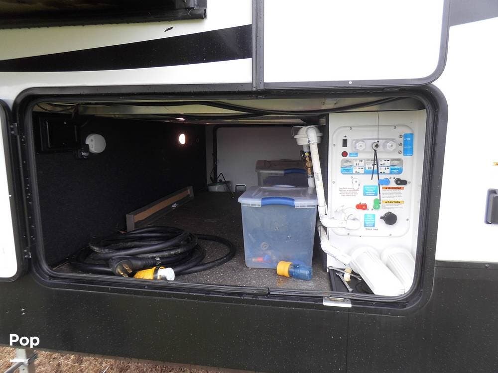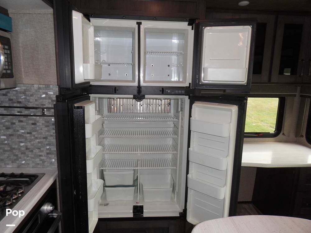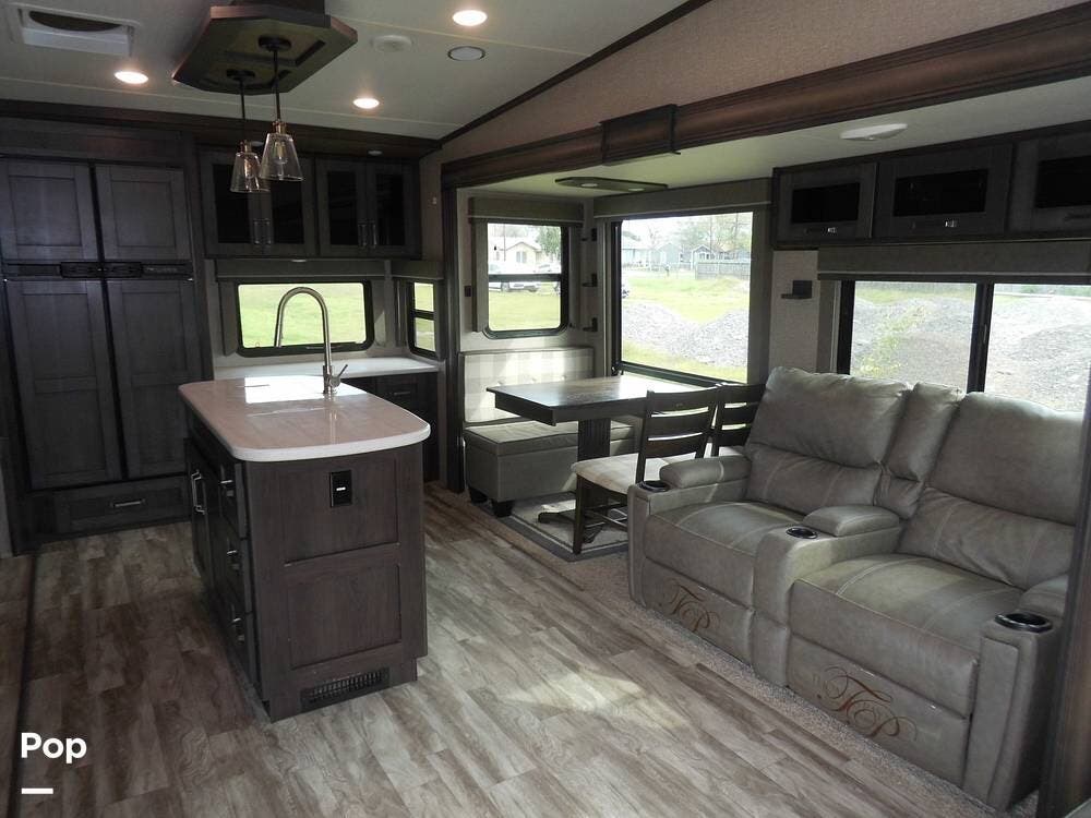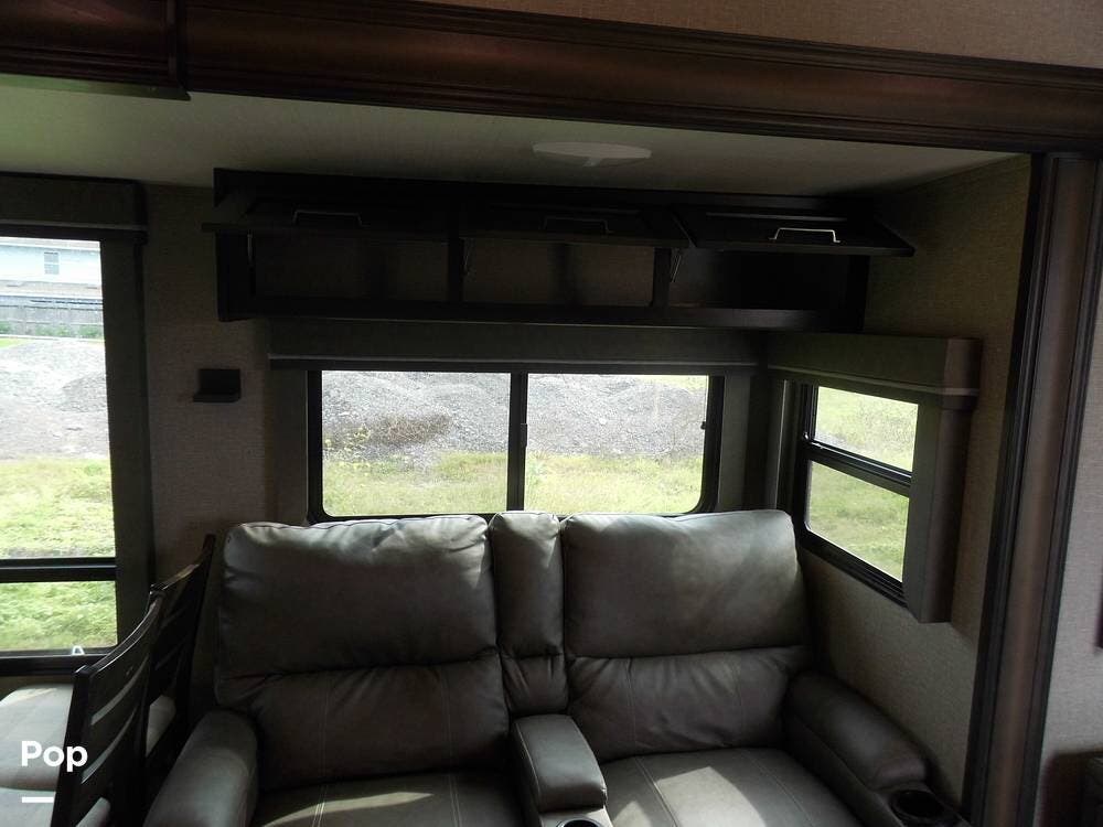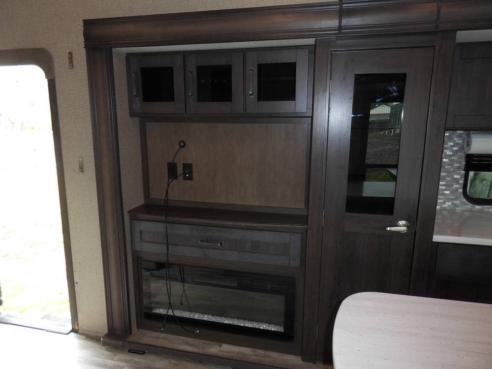The 5th wheel is equipped with the Four Season package, which includes a 35k BTU high-capacity furnace, a heated and enclosed underbelly with circulating heat, a double-insulated roof and front cap, and 12V heat pads on the holding tanks.