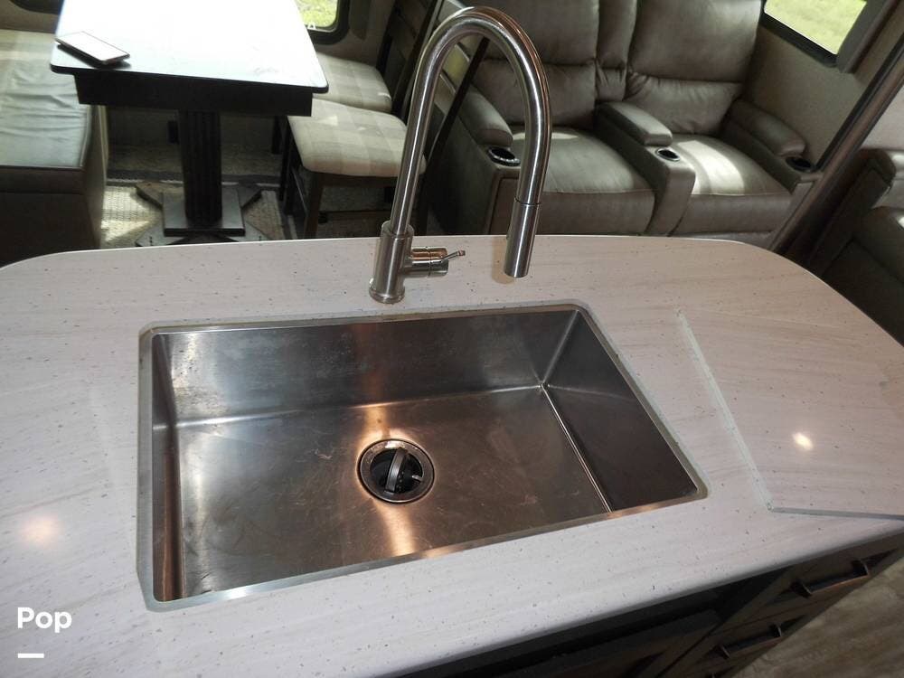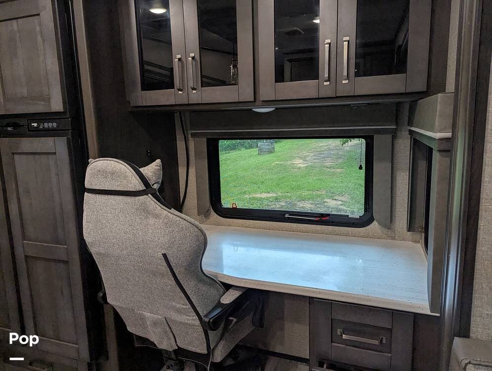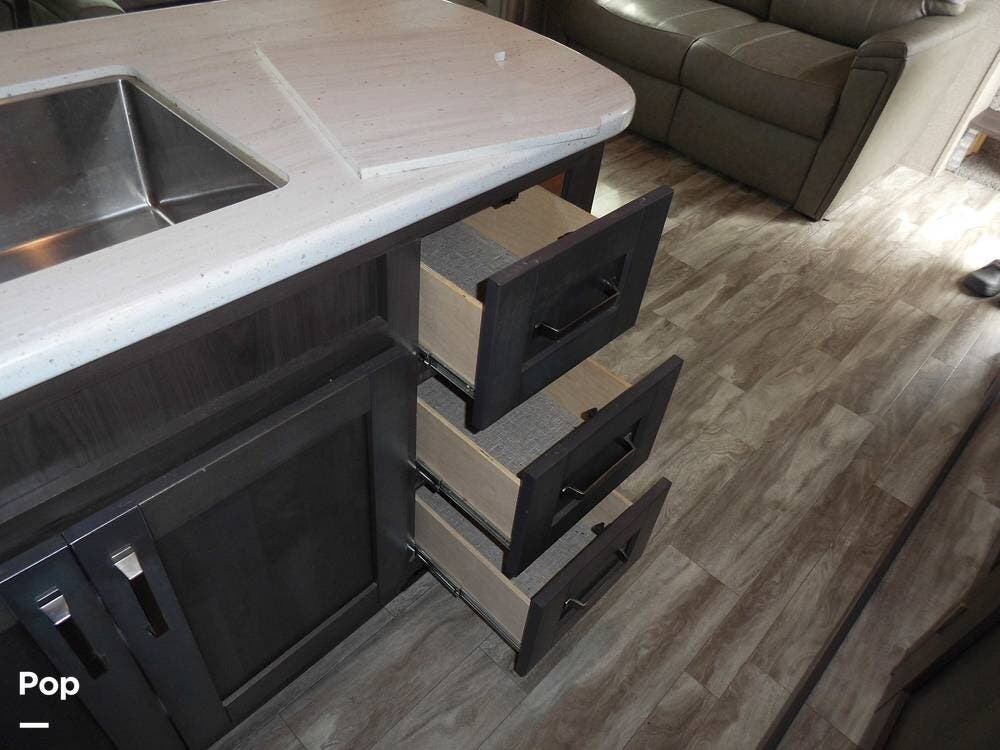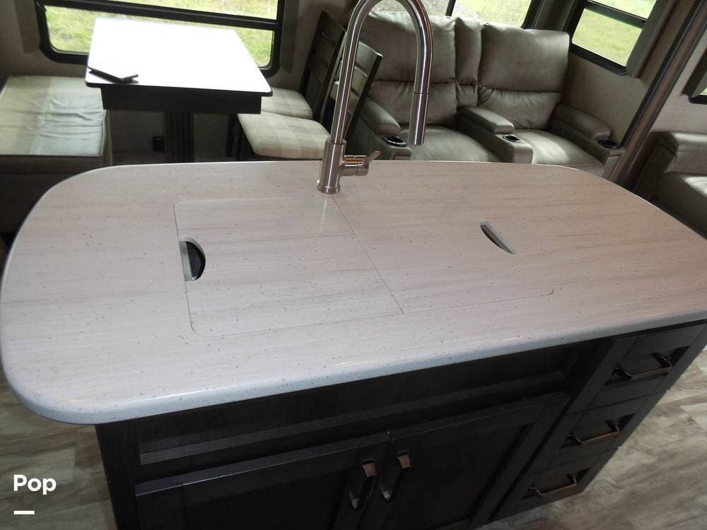 The kitchen features solid-surface countertops, a deep-seated stainless steel sink with a high-rise pull-down faucet, a 3-burner cooktop with oven, a large microwave, and a 12V refrigerator. A dedicated rear desk/workstation area with drawers is a unique floor plan feature.