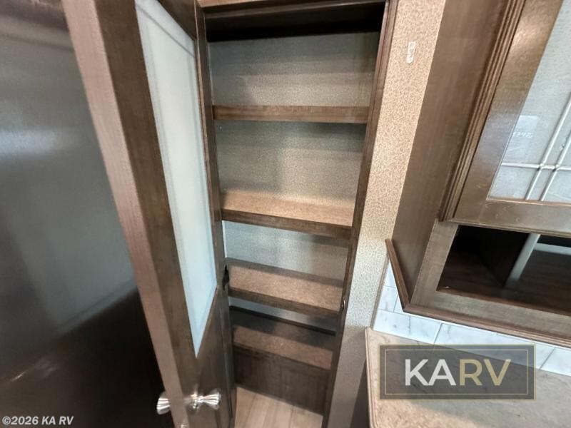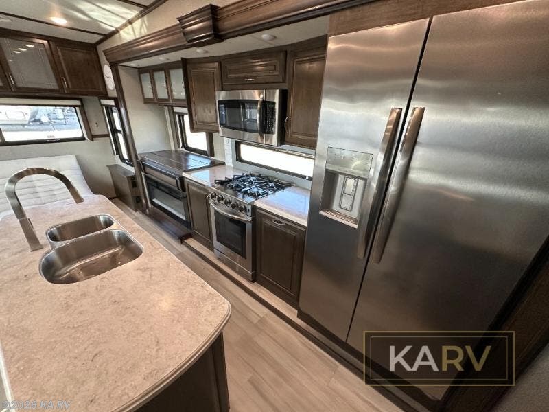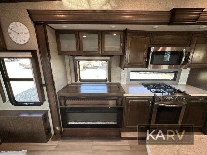 If you are on the search for a livable fifth wheel for those month-long trips, this Solitude might be the one! Just imagine cooking on a professional-grade stainless steel cooktop and inside a built-in oven or microwave. The cook can prepare the meals on the kitchen island and store leftovers in the stainless steel 18 cu. ft. four-door refrigerator. When you and your spouse aren't outside, the LED Smart TV in the living area can keep you entertained while staying warm by the fireplace. There is plenty of storage throughout for your shoes under the steps, dry goods in the large pantry with shelves, linens, and your wardrobe in the front bedroom with a rod and shelving. You might even like to choose a few options such as adding a stackable washer and dryer, a dishwasher, a king-size bed, or even a pull-out kitchen outside.